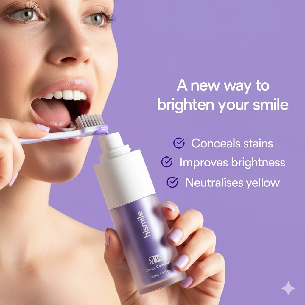The Hismile V34 Colour Corrector Serum introduces a revolutionary way to instantly brighten and enhance your smile. Using innovative purple colour-correcting technology, this serum works by counteracting unwanted yellow tones on the teeth, helping you achieve a noticeably whiter and more radiant appearance within seconds. Unlike traditional whitening treatments that rely on peroxide or harsh bleaching agents, the V34 serum provides a gentle, non-invasive approach that is safe for everyday use and suitable for sensitive teeth.Formulated to conceal stains from coffee, tea, wine, and smoking, it instantly refreshes your smile by creating a balanced, natural white shade. The lightweight texture makes it easy to apply, ensuring quick results without any lengthy waiting time or discomfort. Its enamel-friendly formula not only improves brightness but also supports your confidence by delivering a polished and vibrant look after every use.