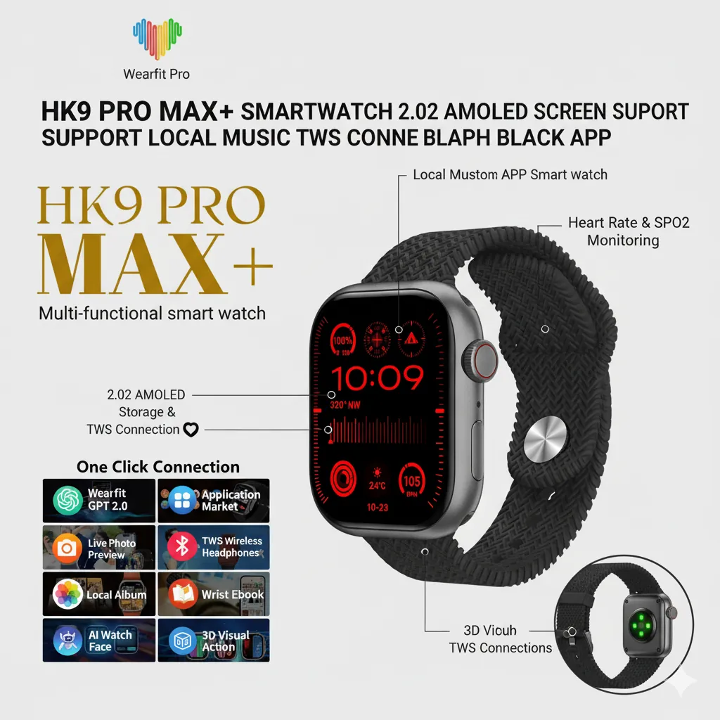 The HK9 Pro Max+ Smartwatch is a premium wearable designed for those who demand both style and performance. Its sleek design and 2.02-inch ultra-clear AMOLED display deliver a superior viewing experience with vibrant colors and smooth touch response.