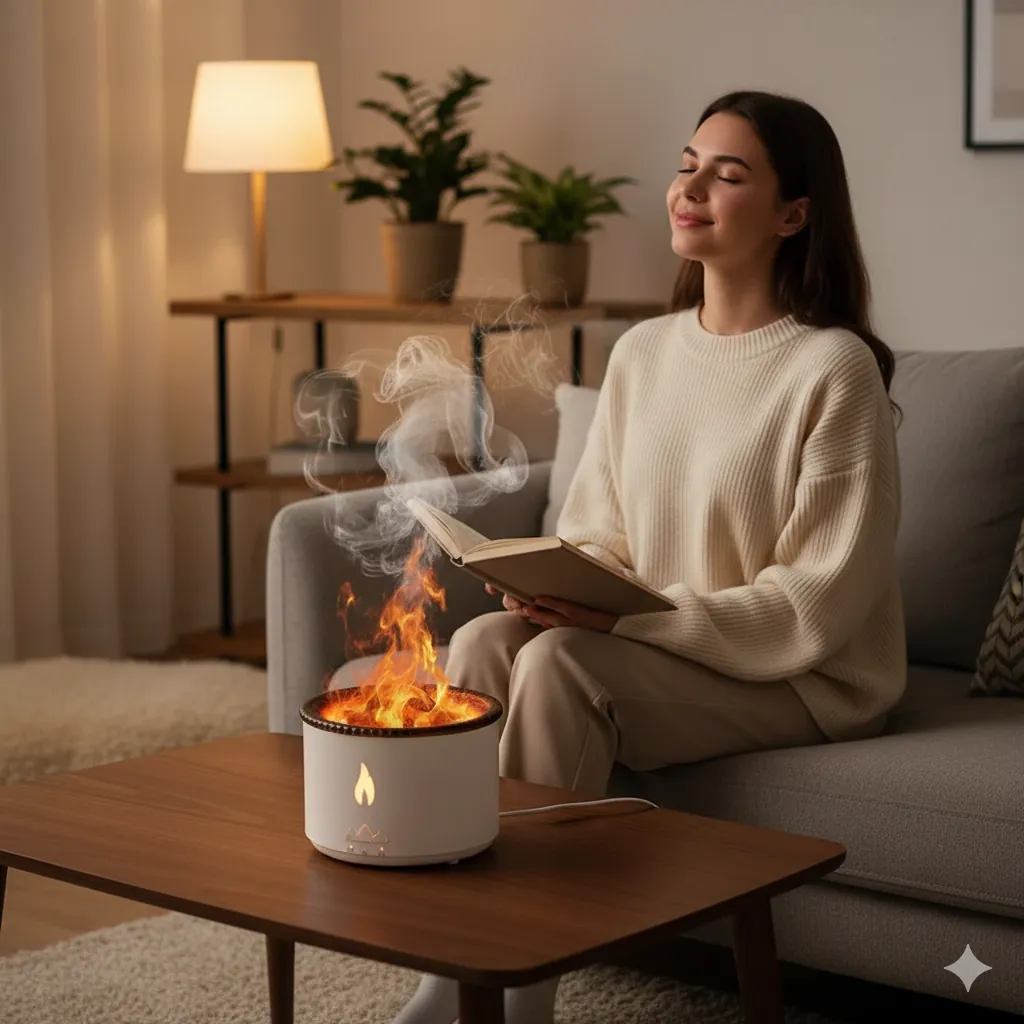 Soothing Flame Effect Humidifier and Aroma Diffuser: Ultrasonic Essential Oil Diffuser for Home, Office, and Bedroom – Creates Relaxing Fireplace Ambiance and Moist AirThis unique device combines the benefits of a humidifier and an aroma diffuser with the visual appeal of a simulated fireplace. It adds moisture to the air, helping to alleviate dryness, while simultaneously diffusing your favorite essential oils for a relaxing and fragrant atmosphere. The realistic flame effect, created by LED lights, adds a touch of warmth and ambiance to any room. It may include timer settings (2h, 8h) and adjustable light settings.