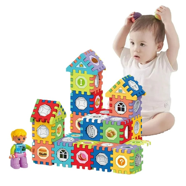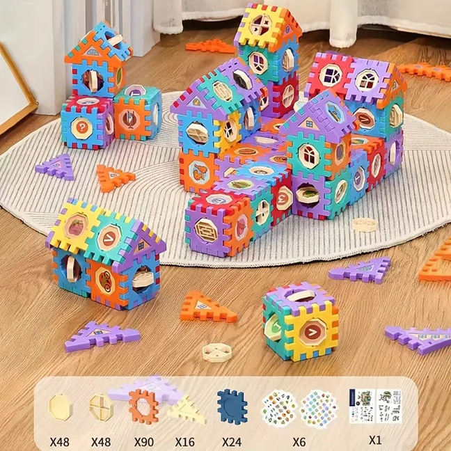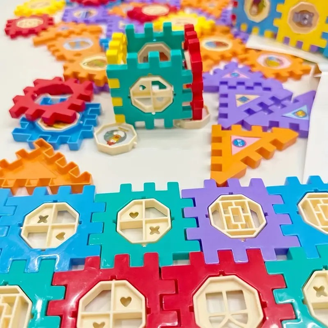 Ignite creativity and cognitive development with this vibrant Interlocking Cubes & Triangle Building Blocks Set. This comprehensive educational toy features a variety of colorful interlocking cube pieces with different cut-out shapes (windows, doors, question marks, letters, numbers), along with complementary triangle shapes, gears, and decorative inserts. Perfect for children, this set encourages imaginative construction of houses, castles, and abstract structures. It significantly aids in developing fine motor skills, spatial reasoning, shape recognition, and problem-solving abilities. Made from durable, child-safe materials, these easy-to-assemble blocks offer endless possibilities for hands-on, engaging play, making it an ideal gift for fostering early learning and creative expression.