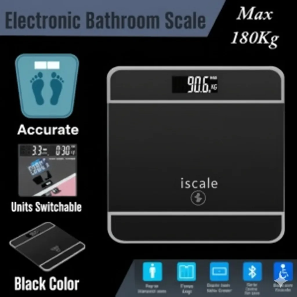 The iScale Electronic Bathroom Scale is engineered for precision and convenience, making it an essential tool for monitoring your health and fitness journey. This advanced scale boasts a robust 180Kg (approximately 400 lbs) maximum capacity, ensuring it meets a wide range of user needs. Equipped with high-accuracy sensors, it delivers consistent and reliable weight measurements. A standout feature is its Units Switchable capability, allowing you to effortlessly toggle between kilograms (kg) and pounds (lb) to suit your preference. The elegant, durable black tempered glass platform is not only stylish but also easy to clean and built to last. Its clear digital display ensures your readings are visible at a glance. Embrace smarter health tracking with the iScale's combination of accuracy, versatility, and modern design.