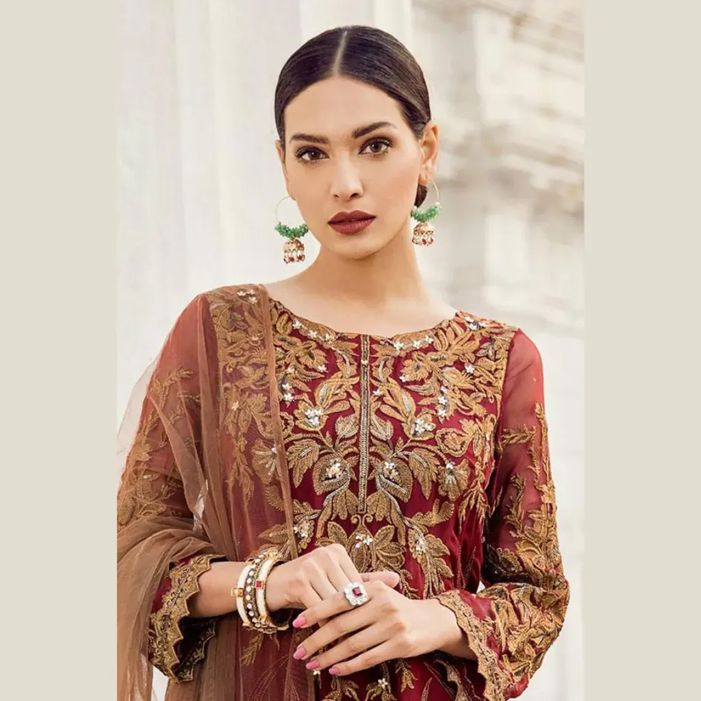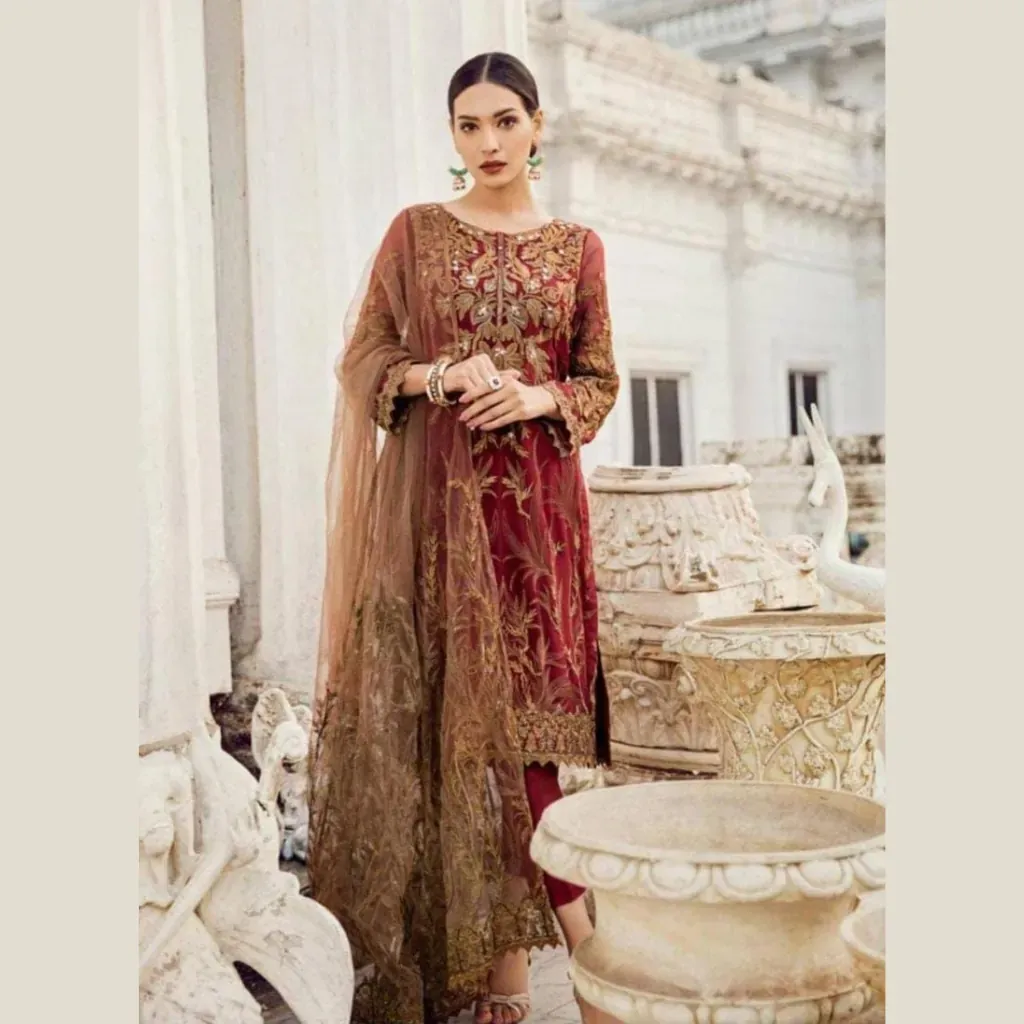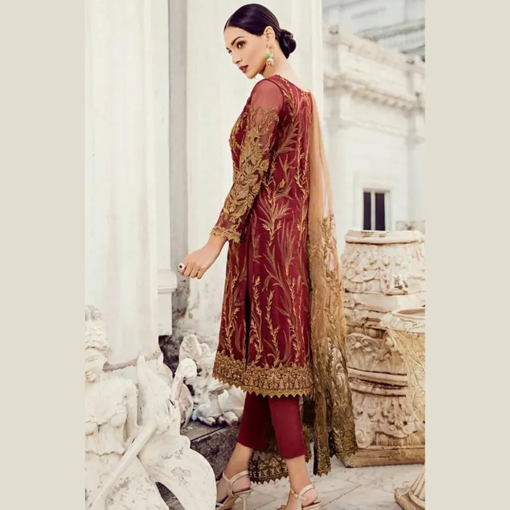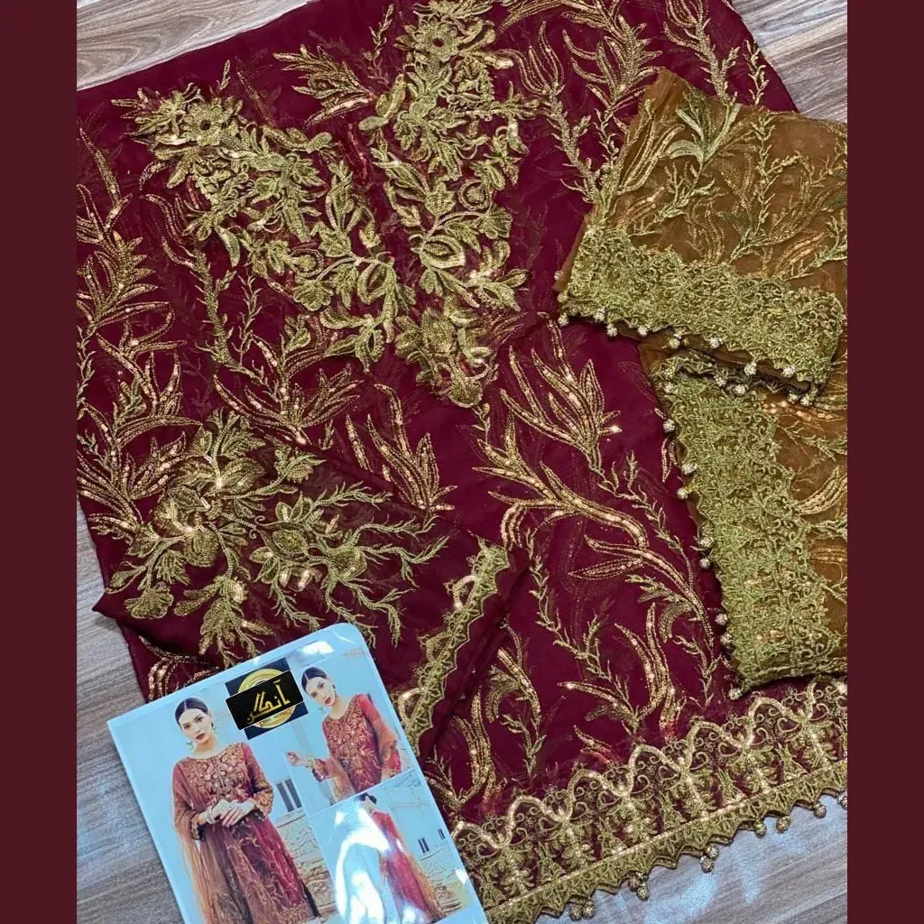 Elevate your wardrobe with this Iznik Chiffon Embroidered Sequence 3Pc Suit. Featuring rich embroidery on the front, back, sleeves, and neckline with elegant daman patches, paired with a soft malai trouser. The look is completed with a stunning embroidered net dupatta, making it perfect for festive and wedding occasions.