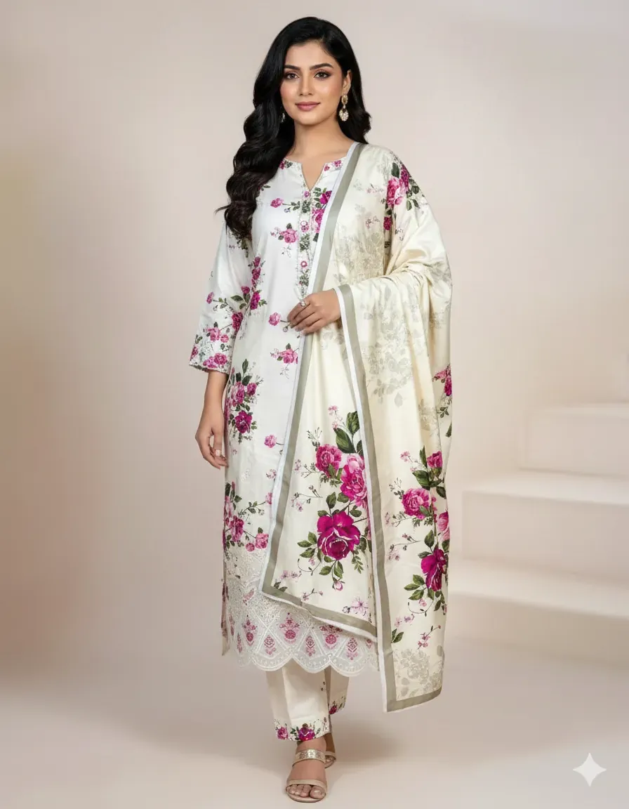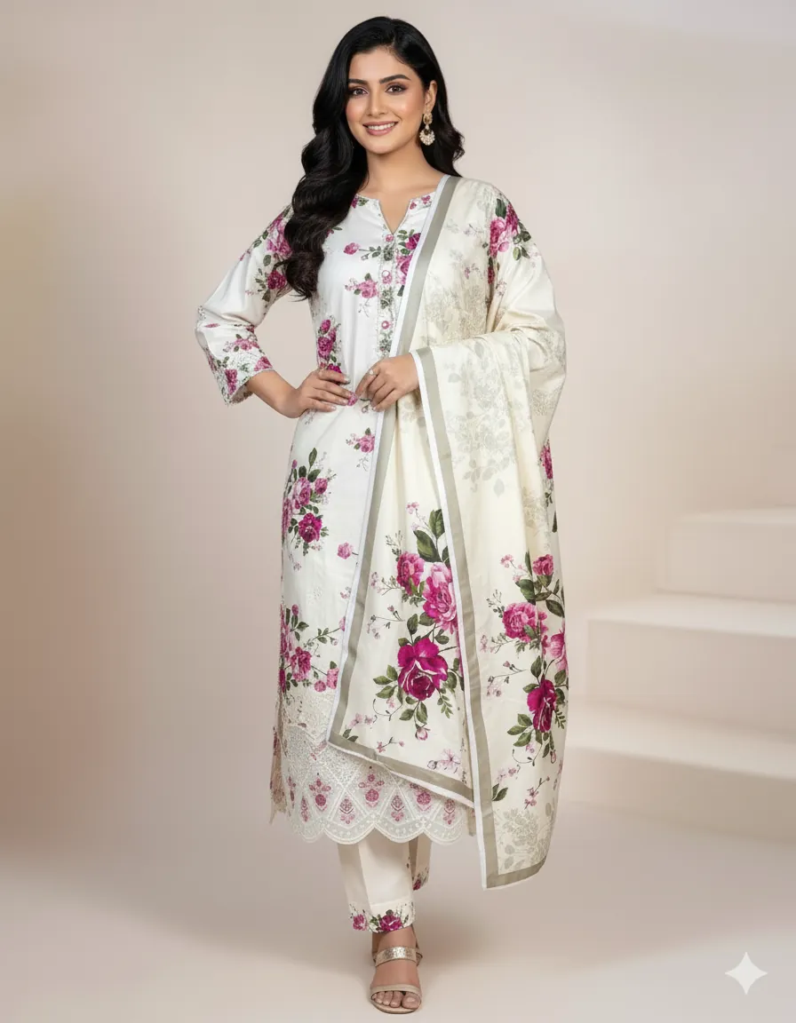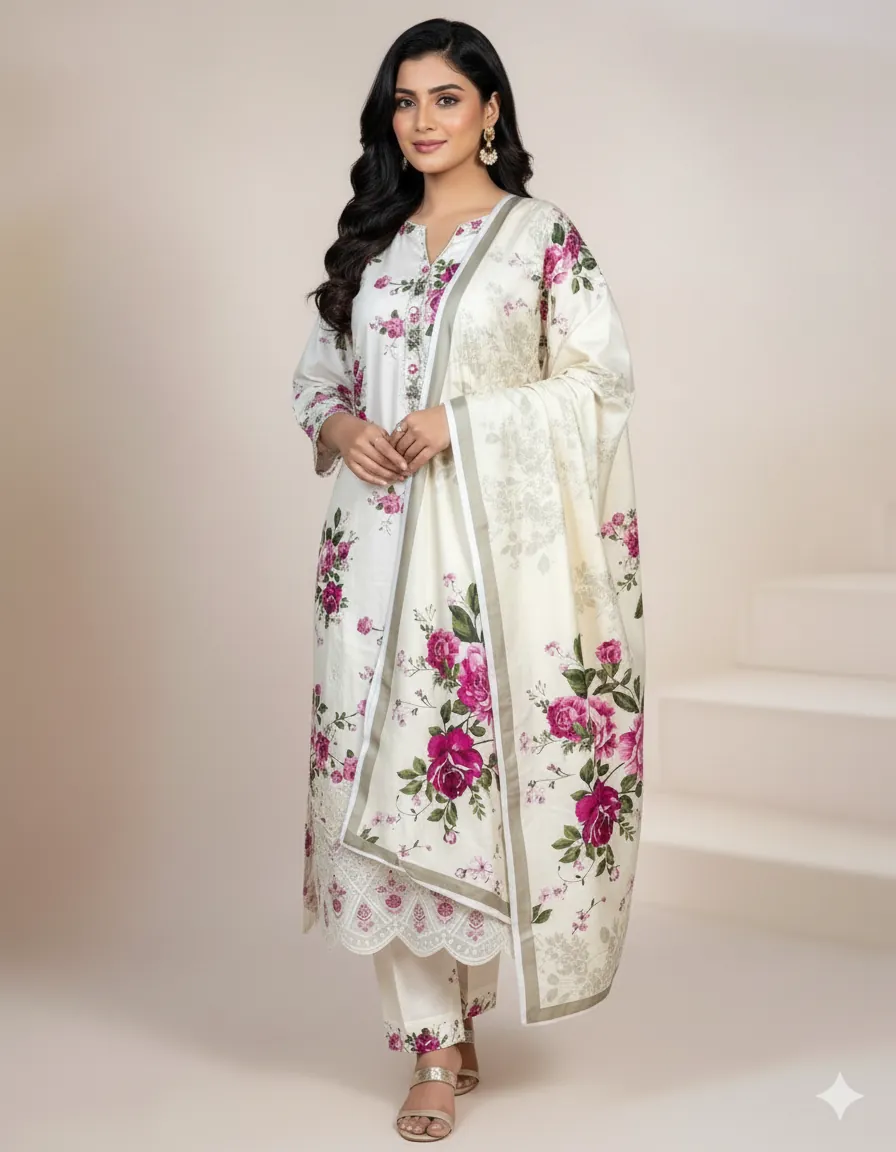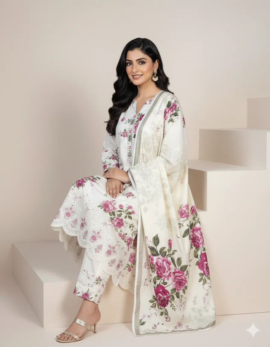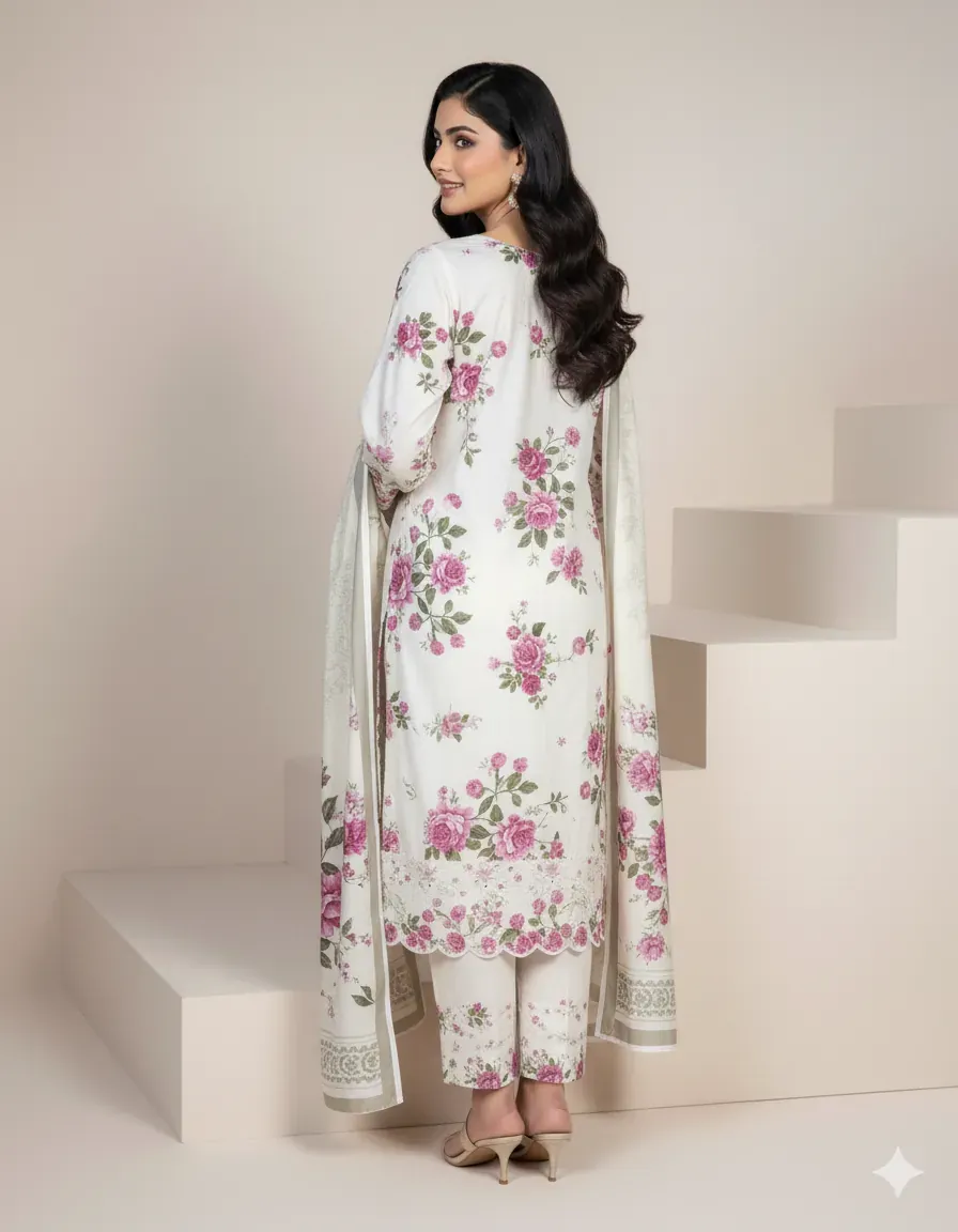 The highlight of this design is the beautifully finished daman (hem) which showcases delicate applique work and a precise cutwork embroidered border, giving the suit a truly unique and high-end look. The set is completed with a matching digital printed dupatta, also made from the same soft linen fabric, ensuring a cohesive and chic appearance. Each suit comes meticulously packaged in a beautiful branded bag with an inlay card, making it a perfect gift or a special addition to your collection.