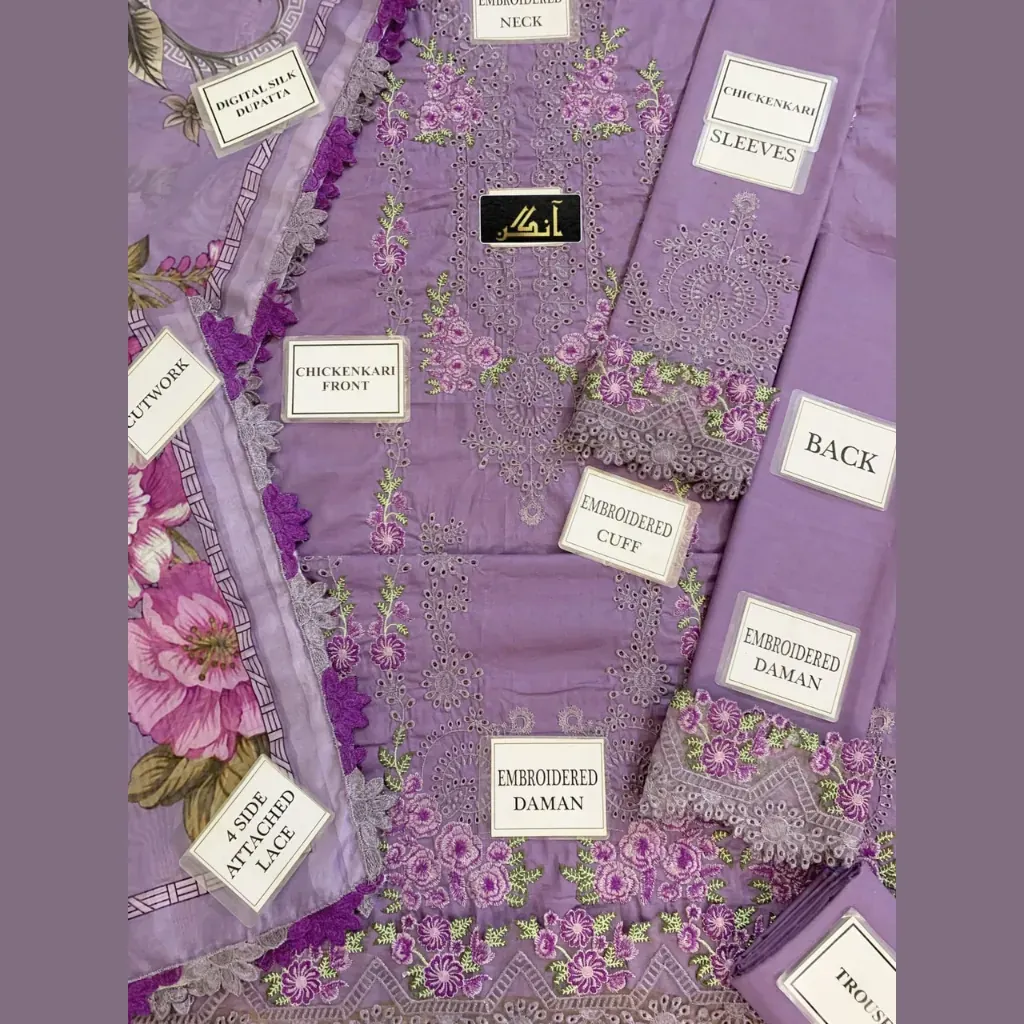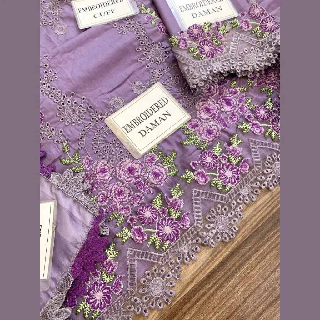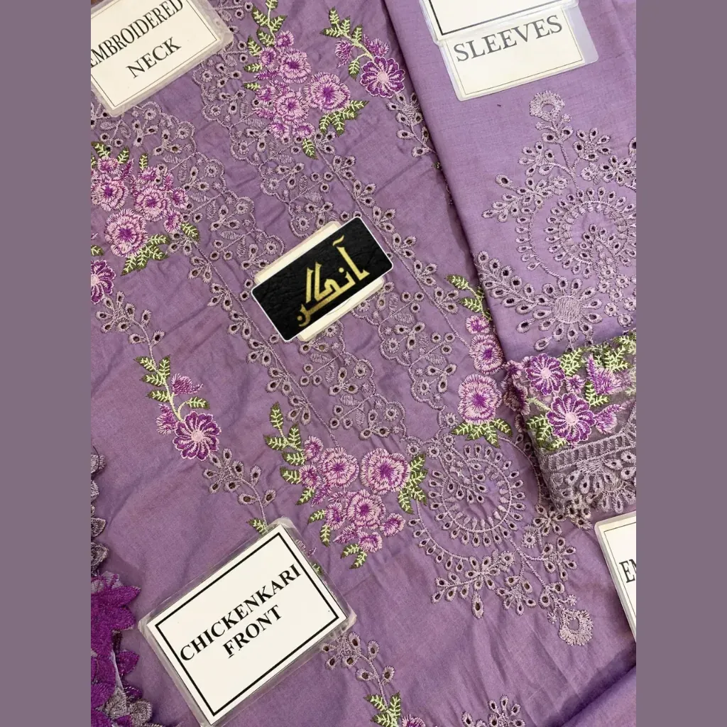 Crafted with premium quality lawn cotton, the embroidered front and neckline bring out the richness of chikankari artistry, while the embroidered daman patch adds extra refinement to the look. The schiffli embroidered sleeves with cuff patch create a luxurious finish, making this outfit a true statement piece.