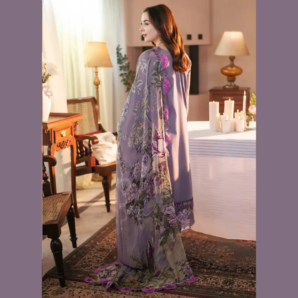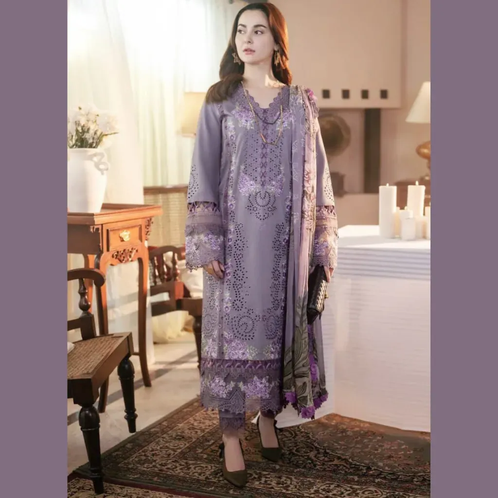 The highlight of this ensemble is the digital printed dupatta adorned with 4-side embroidered cutwork lace, offering a chic and stylish appeal. Paired with a plain dyed trouser, it strikes the perfect balance between elegance and comfort, making it a must-have in every luxury wardrobe.