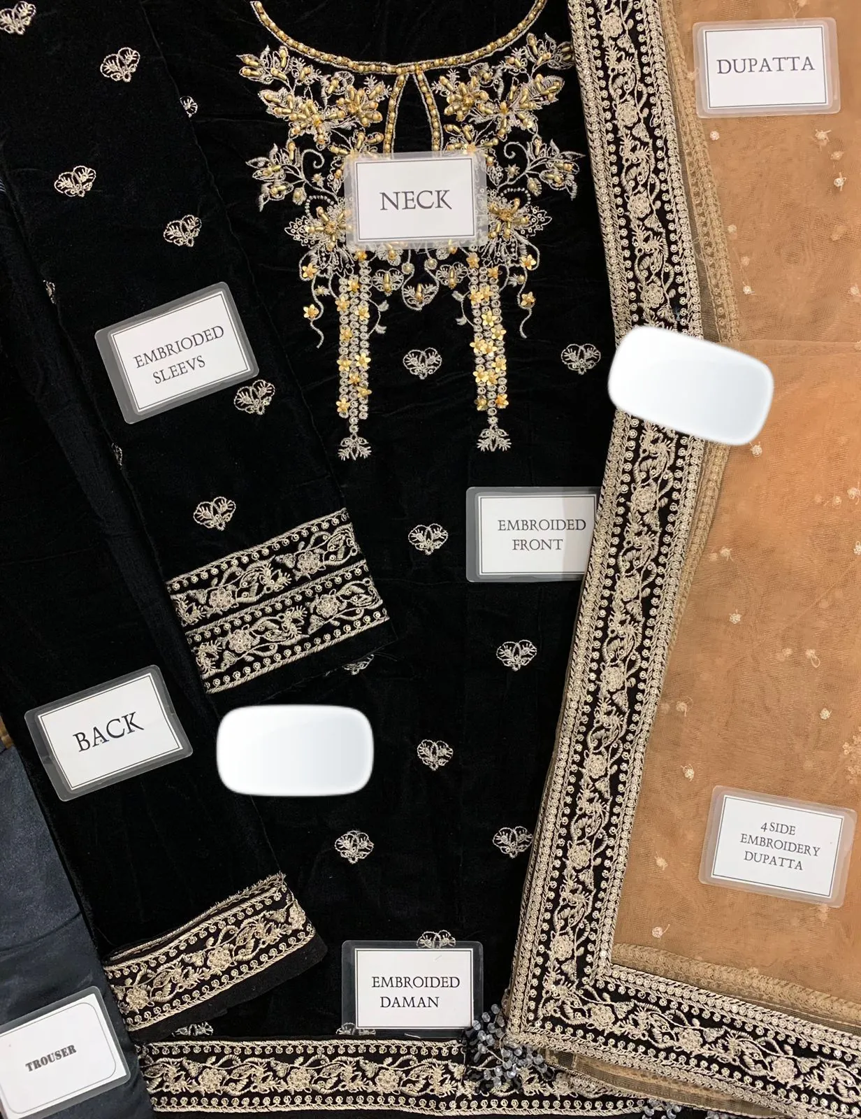 JAZMIN Black Velvet Embroidery Suit | Handwork Neck & Daman | Luxury Master Replica Net Dupatta