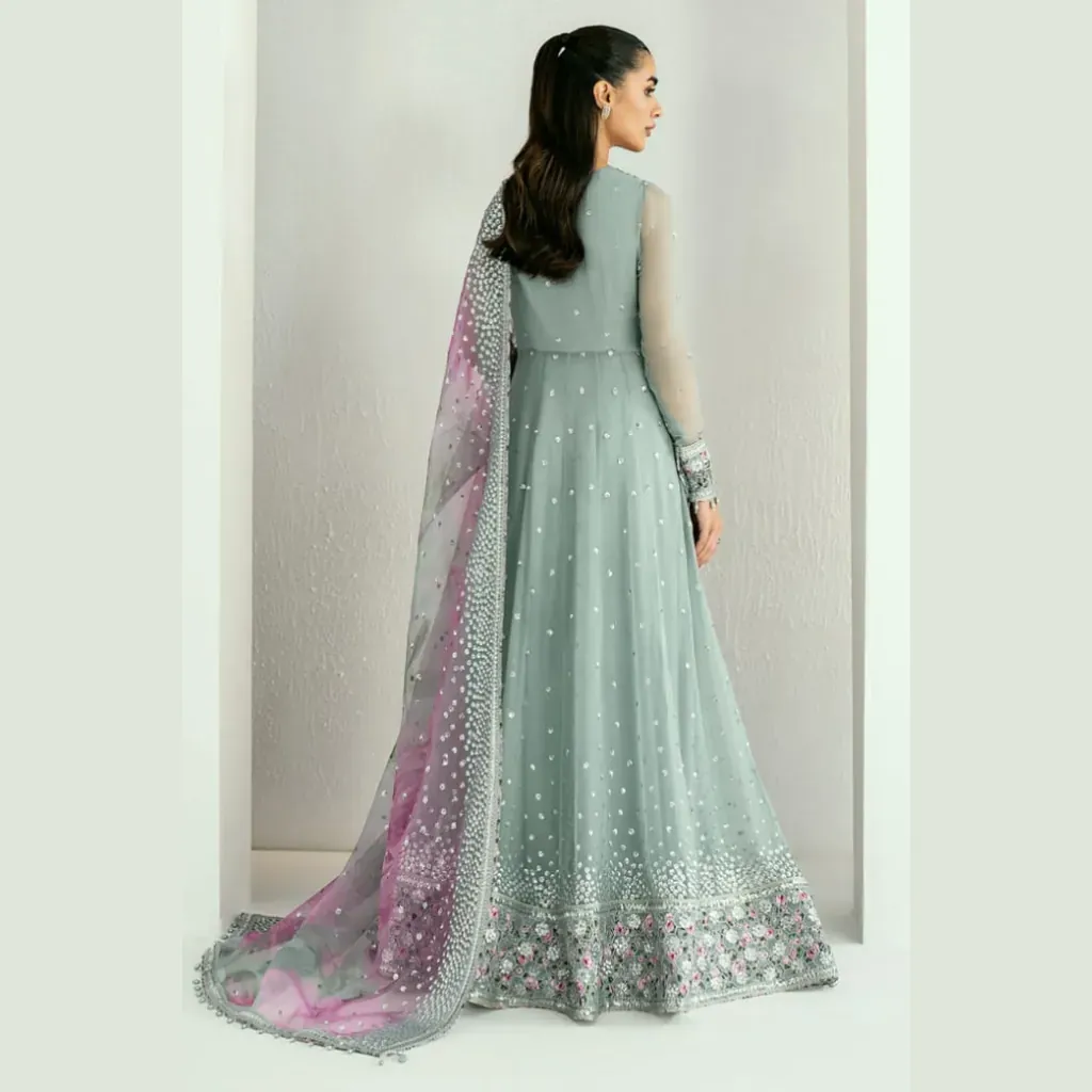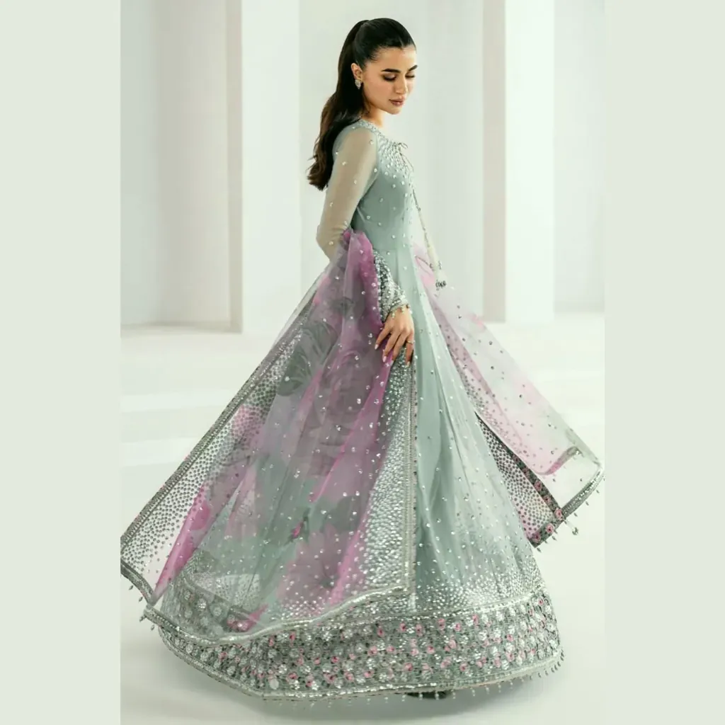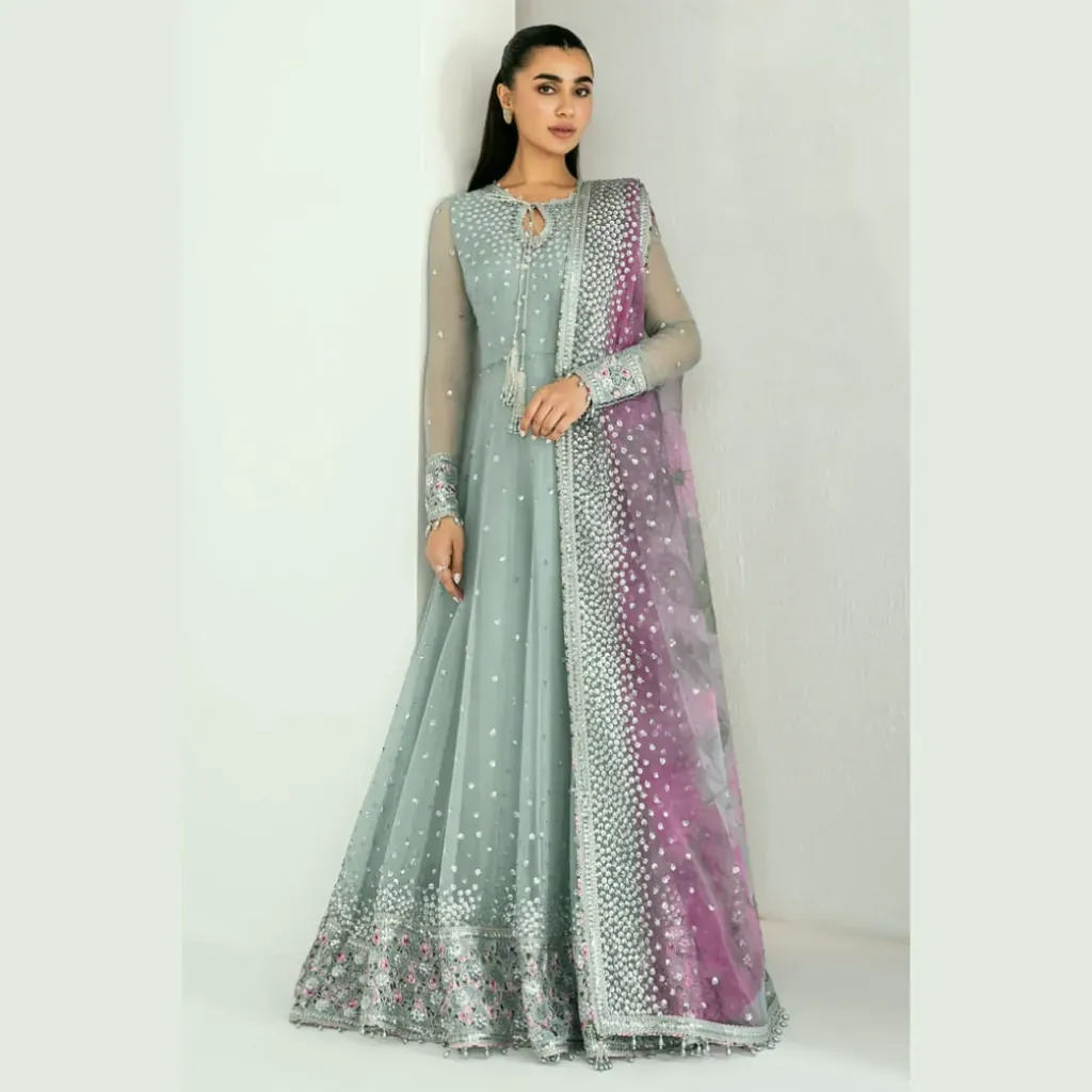 To complete this luxury attire, the dress includes a shamooz silk trouser for premium comfort and a ready-to-wear net tie & dye dupatta, making it a fashion-forward statement piece.