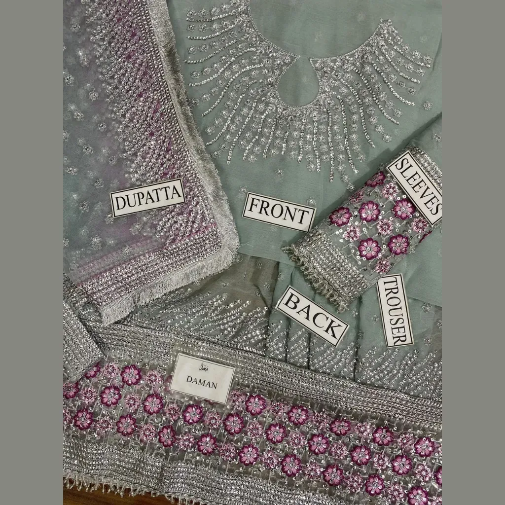 Step into timeless elegance with the Jazmin Chiffon Embroidered Sequence Maxi – Unstitched 3PC Dress. The chiffon embroidered sequence maxi paired with a matching embroidered body and sleeves creates a regal look. The front & back daman is adorned with exquisite moti work patches, bringing richness and finesse to the design.