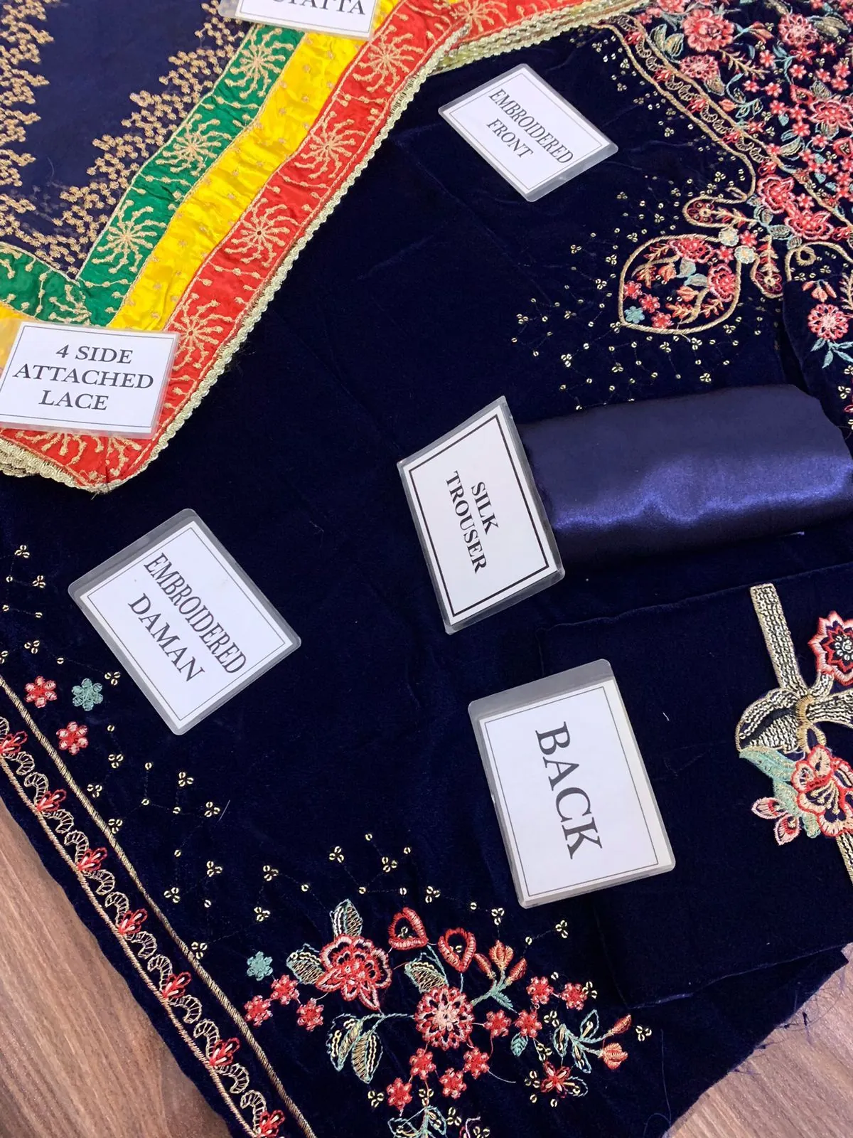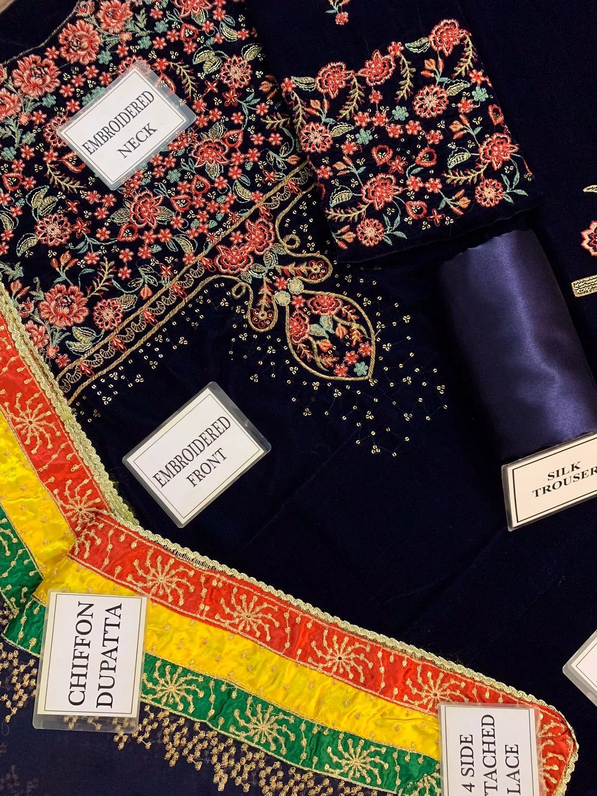 JAZMIN Luxury Navy Velvet Suit with Heavy Multi-Color Floral Embroidery | Chiffon Dupatta with 4-Side Gota Lace | Festive Collection