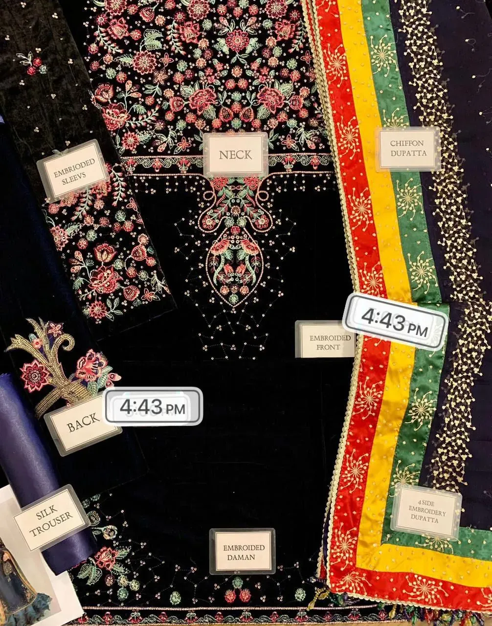 Step into the spotlight with this elegant piece from the JAZMIN 2024 Velvet Luxury Wedding Collection. This three-piece suit is a perfect blend of rich velvet fabric and intricate embroidery. The velvet shirt boasts a fully embroidered front and daman, while the back is kept plain with a beautifully detailed embroidered bunch. The sleeves are also heavily embroidered, adding to the luxurious feel. The ensemble is completed with a chiffon dupatta that features delicate embroidery and is finished with a four-sided embroidered and gota lace, giving it a grand, festive look. Paired with a smooth silk trouser, this