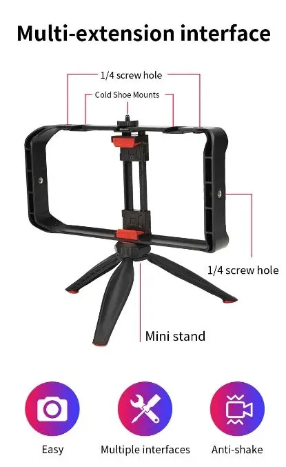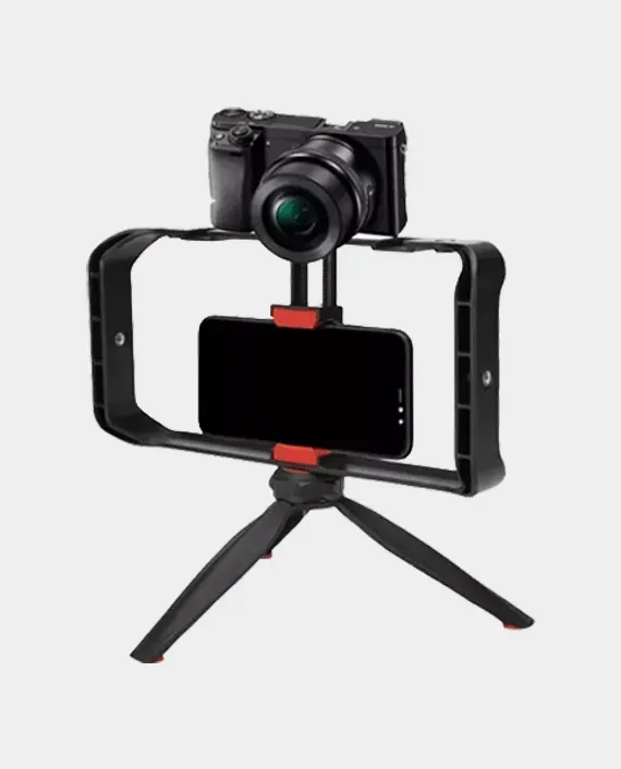 The Jmary MT-33 is a versatile 3-in-1 handheld stabilizer rig designed for vloggers, YouTubers, and mobile filmmakers who need professional-grade stability and expandability. Its innovative U-shaped aluminum alloy frame features a built-in spring-loaded phone clamp (fits 5.5–8.5 cm wide devices) and a central 1/4" screw mount for attaching DSLRs, mirrorless cameras, or action cams. Dual cold shoe mounts on top allow simultaneous attachment of LED fill light and external microphone, while the detachable mini tripod base converts it into a stable desktop stand. The ergonomic anti-slip handle ensures comfortable grip during extended handheld shooting, reducing shake for smoother footage. Foldable tripod legs and lightweight construction make it highly portable—perfect for travel, interviews, live streaming, or TikTok/Instagram content creation. Compatible with most accessories via standard 1/4" threads and cold shoes. Ideal for dual-device setups (phone + camera monitoring) or single-device pro rigs.