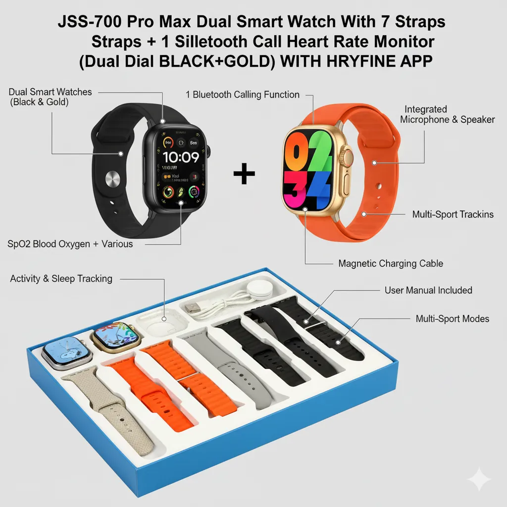 The JSS-700 Pro Max Dual Smart Watch is a premium 2-in-1 smartwatch designed for both fashion and performance. With its dual display dials and sleek Black + Gold finish, it delivers a sophisticated look while keeping you connected on the go.