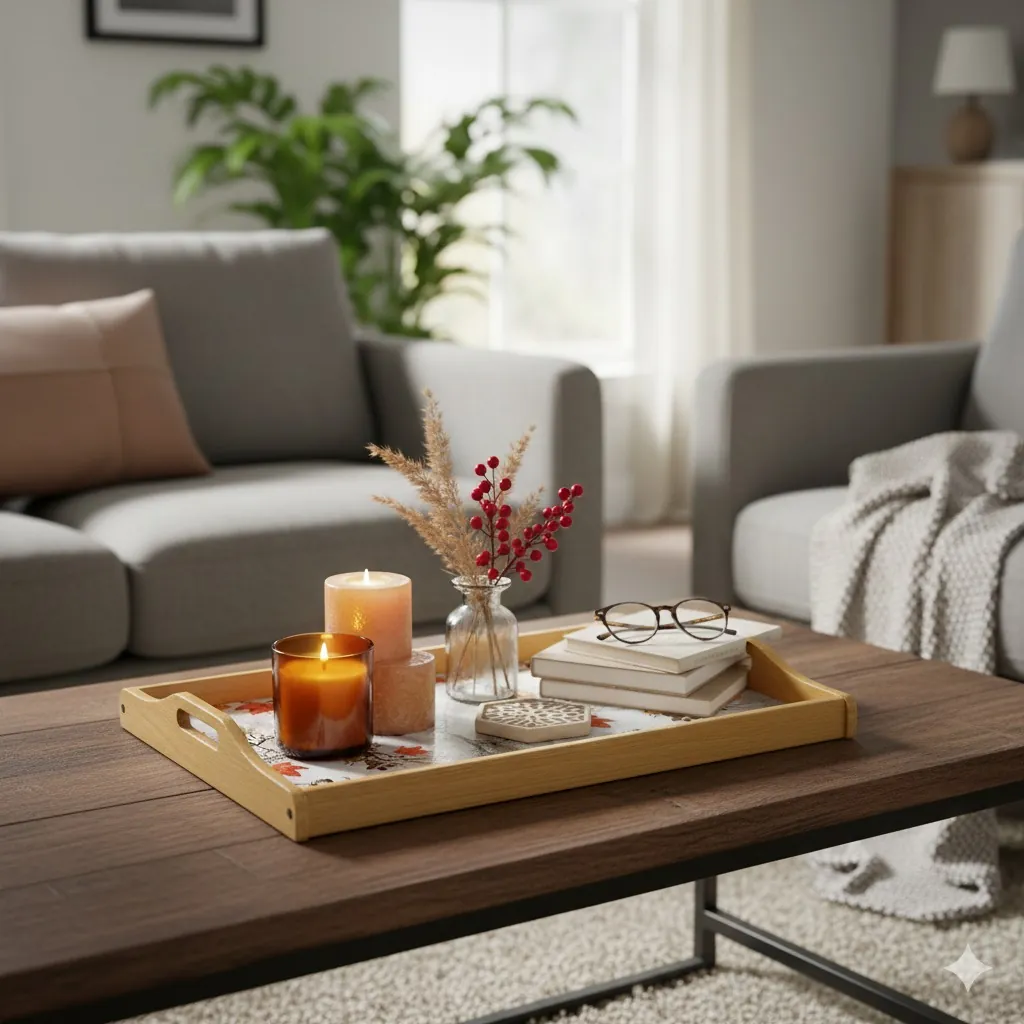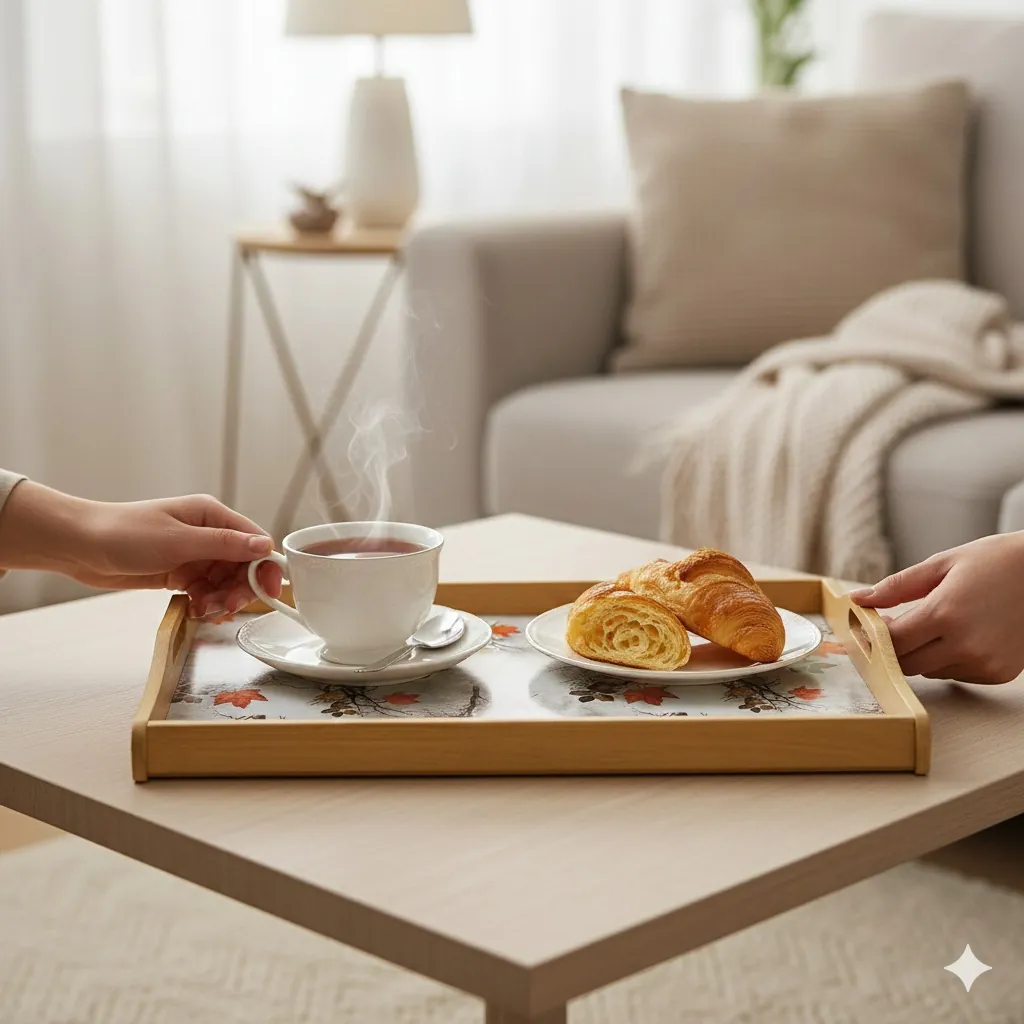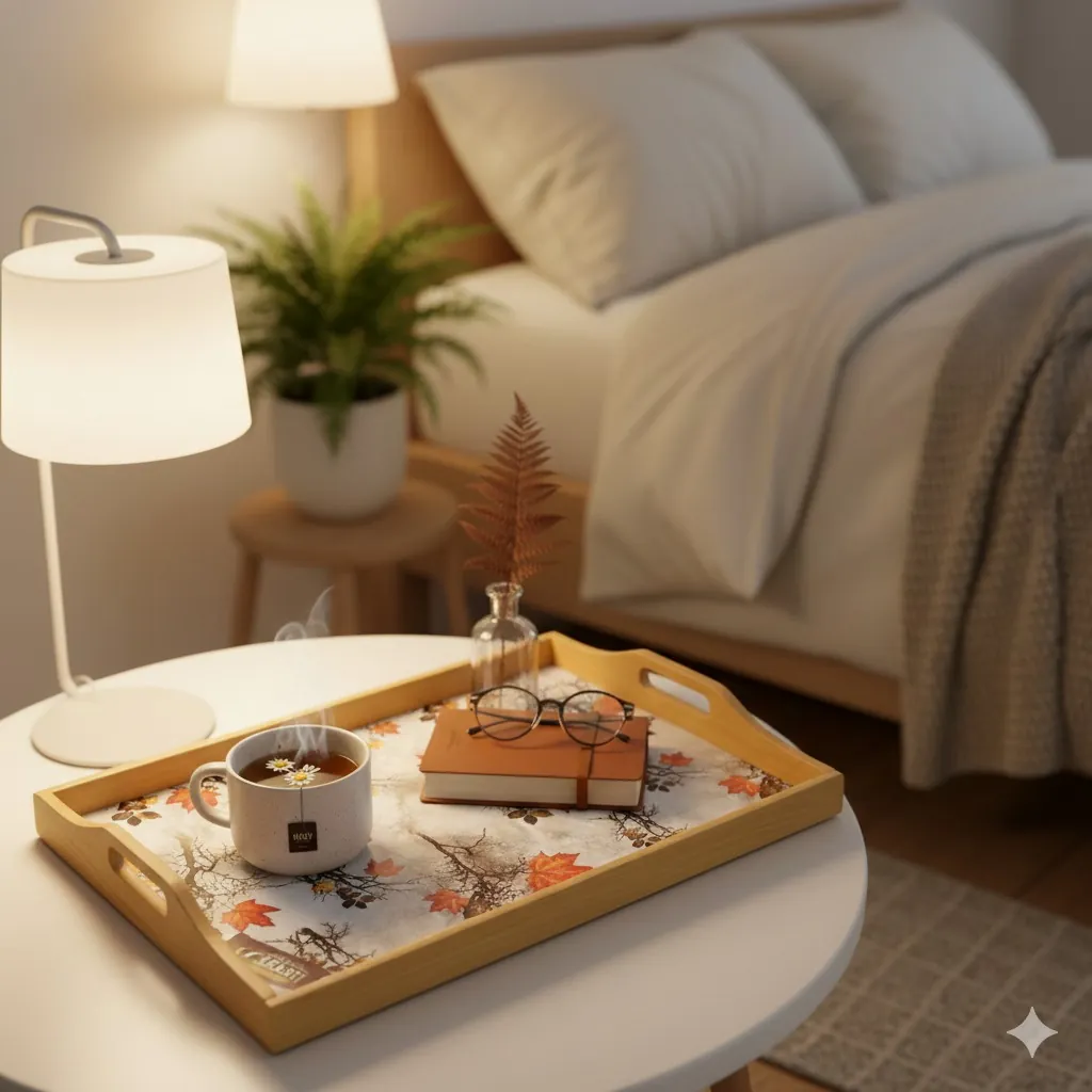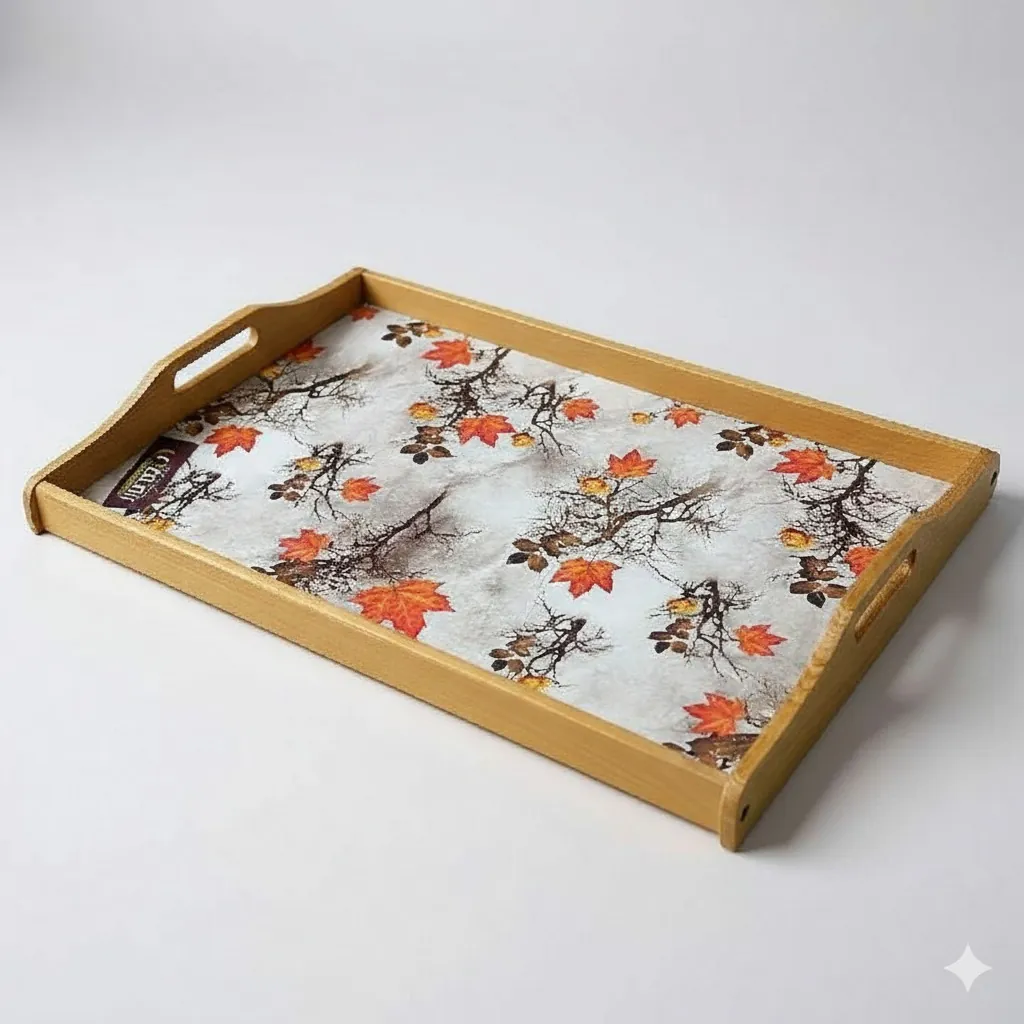 Jumbo Wooden Serving Tray – Autumn Leaf Pattern Large Rectangular Platter with Handles.Bring the warmth of the harvest season into your home with this Premium Jumbo Wooden Tray. Designed for both beauty and heavy-duty use, this tray features a large surface area decorated with a high-definition autumn leaf and branch motif. The natural wood grain of the outer frame provides a rustic touch, while the built-in side handles ensure a comfortable and secure grip during transport.Whether you are hosting a dinner party and need to carry multiple glasses at once, or you want a stylish base for your living room decor, this jumbo tray is up to the task. The smooth, wipe-clean surface ensures that spills are never an issue, making it as practical as it is beautiful.