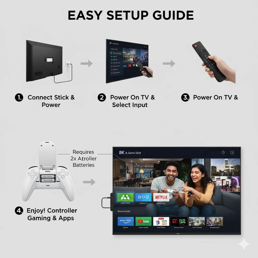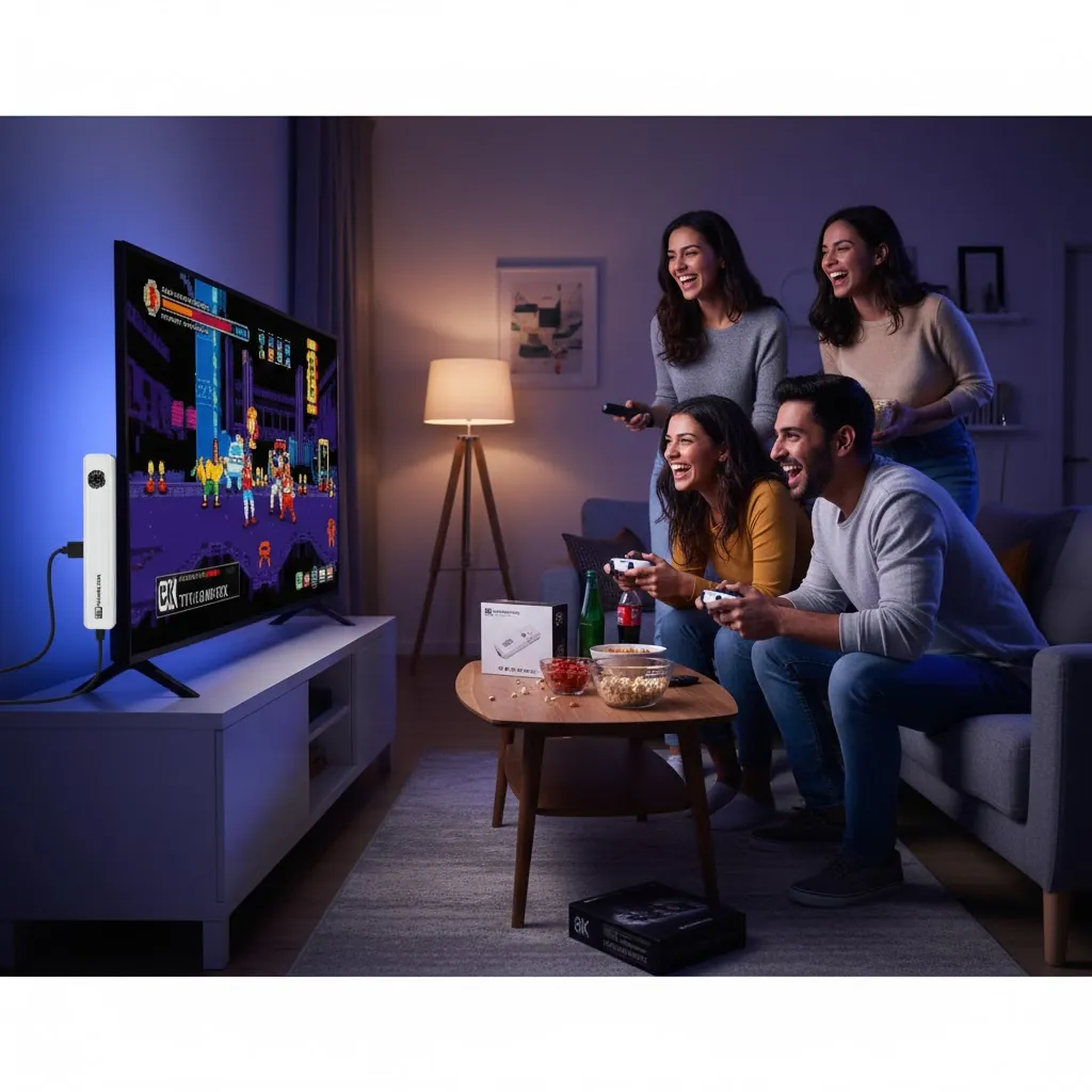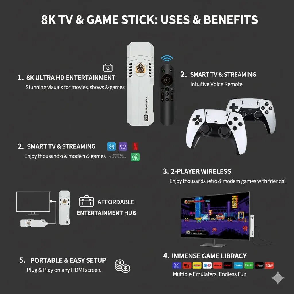 It boasts an extensive library of over 40,000 classic games from popular consoles like PSP, PS1, N64, MAME, and more, all stored on the included 64GB TF card. Powered by the efficient Allwinner H313 Quad-core processor and 2GB RAM, the stick ensures stable emulation and smooth media playback. The cutting-edge HDMI 2.1 output supports breathtaking 8K resolution at 30fps and crystal-clear 4K at 60fps, bringing new life to classic pixel art. The package includes two 2.4G wireless controllers and often a voice remote control, making it the ultimate multi-functional, plug-and-play entertainment center for the whole family.