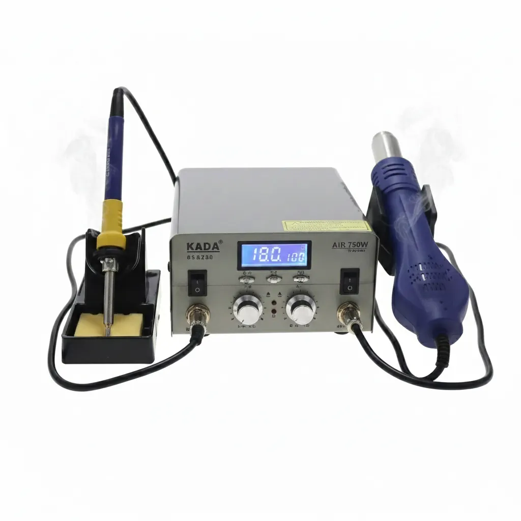 Upgrade your professional electronics repair bench with the high-performance KADA 2018D+ Rework Station. This unit provides a total of machine power, combining a fast-heating hot air gun (with imported heater) and a powerful soldering iron.The station features advanced Temperature Control Technology that rapidly detects and corrects the heating element temperature every, ensuring exceptional stability and soldering quality.The microcomputer LCD display provides precise temperature readings for both tools, supporting both Celsius and Fahrenheit to satisfy diverse global market demands.Key features designed for efficiency include the Integrated Air Gun Three-Speed Temperature Memory (CH1, CH2, CH3) for instant recall of preferred settings, and an Integrated On-Hook Sleep Function which automatically cuts off heat when the air gun is placed in its holderโa critical safety measure.Furthermore, the unit includes a convenient USB mobile phone charging interface, making the KADA 2018D+ the ultimate tool for mobile phone and BGA/SMD chip-level welding.