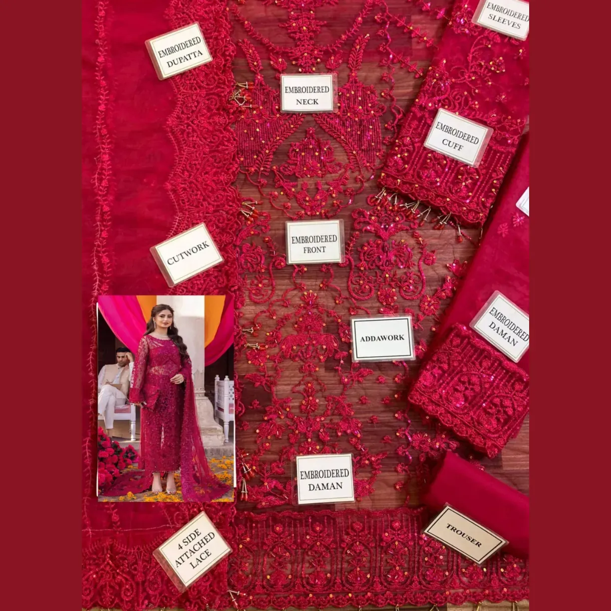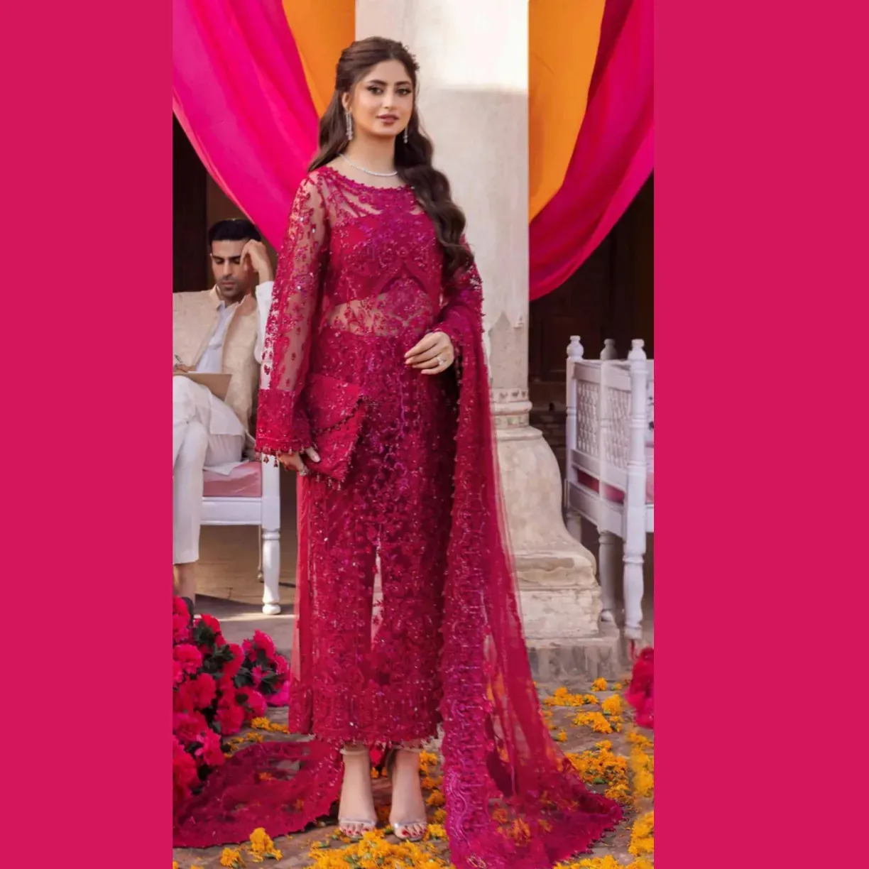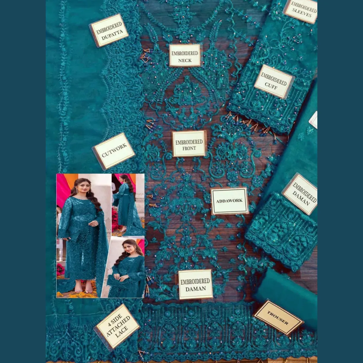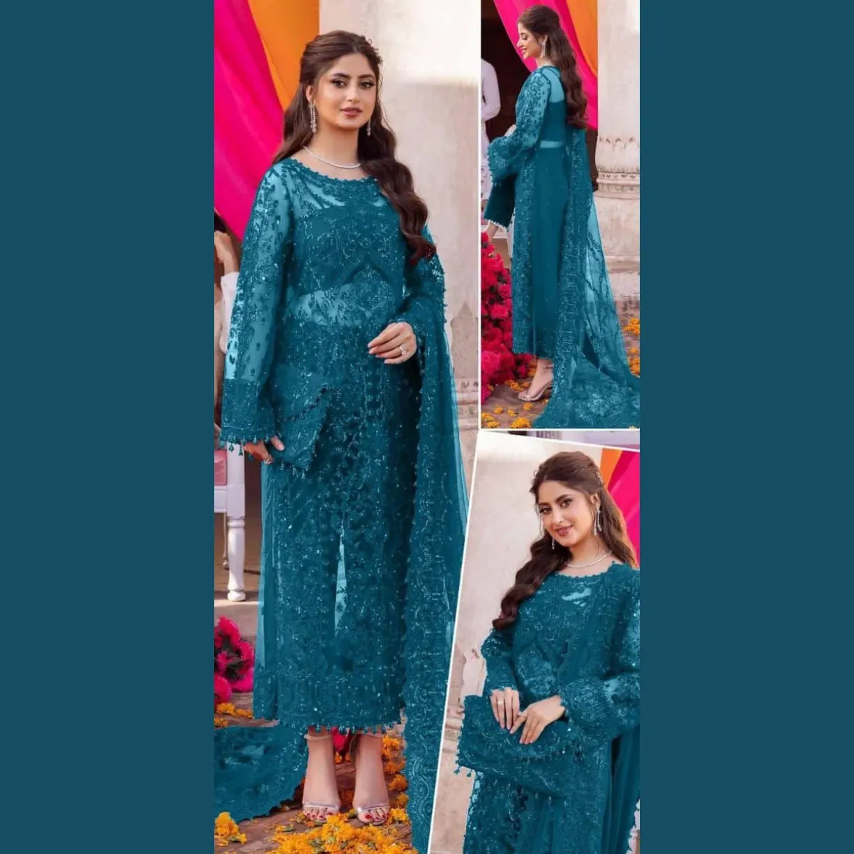 This Azure chiffon embroidered luxury 3-piece suit is a timeless blend of elegance and sophistication. Designed with intricate chiffon sequence embroidery and stylish patches, it offers a graceful look for festive occasion parties, and weddings.