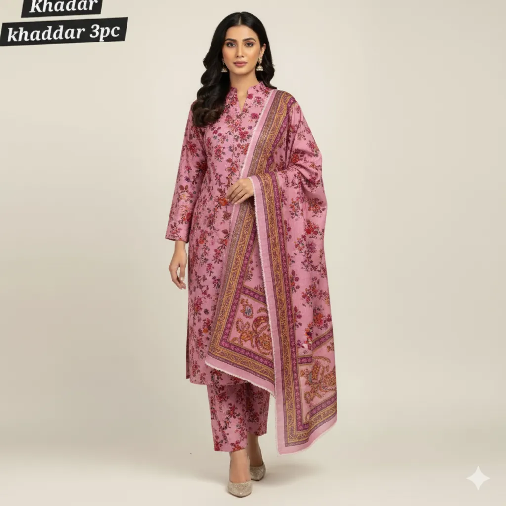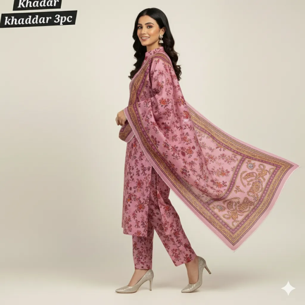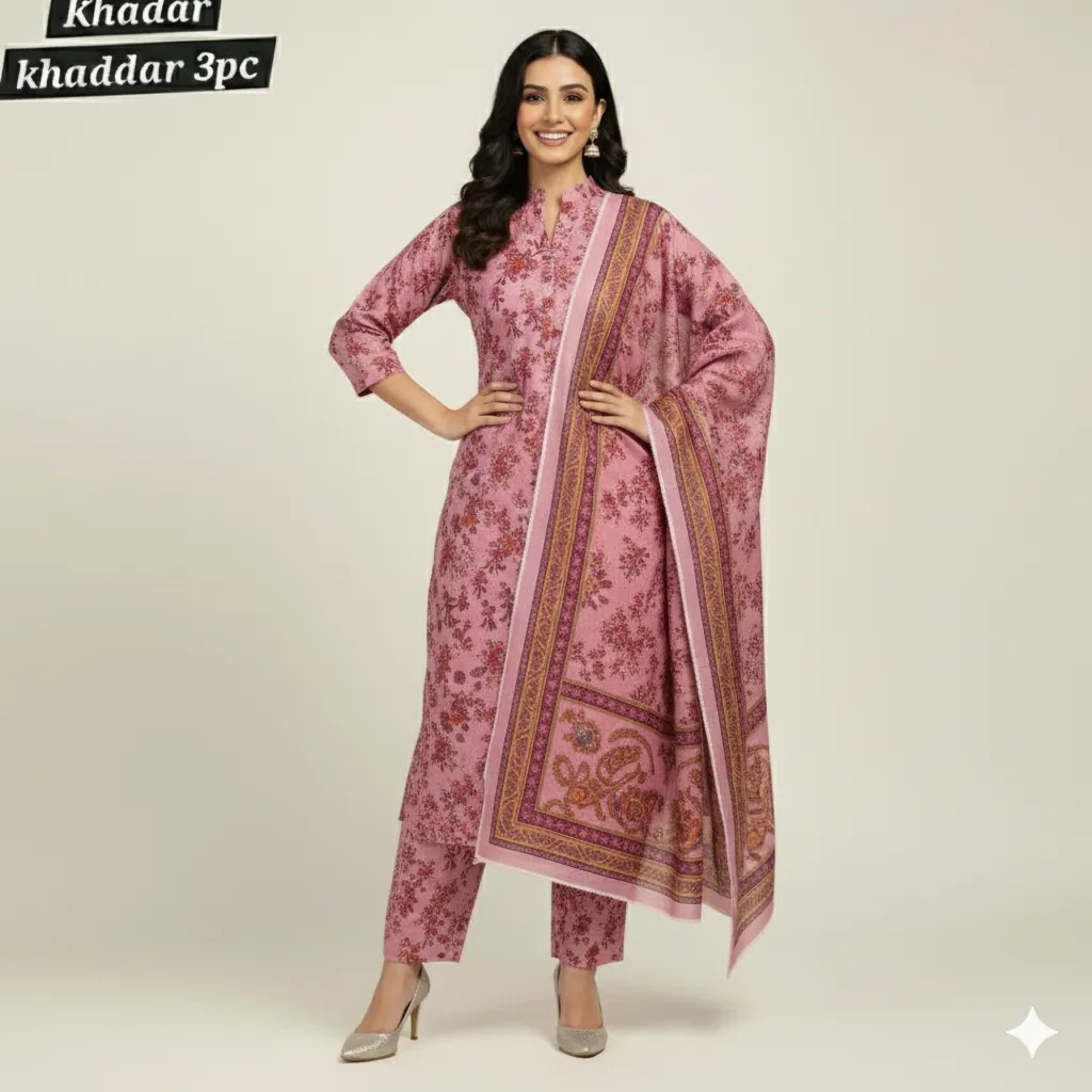 Make a vibrant and elegant statement with this beautiful unstitched 3-piece khaddar suit. This ensemble is a perfect blend of rich, warm colors and classic floral prints, designed for both comfort and a unique sense of style.