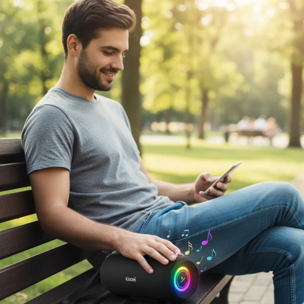 Its RGB LED lights sync with the rhythm of your music, adding color and excitement to any setting — whether it’s a party, picnic, or relaxing evening. The built-in rechargeable battery ensures long-lasting playback time, while the compact, durable design makes it easy to carry anywhere.
