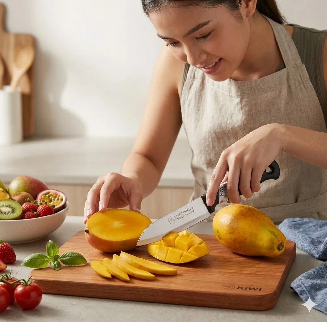 Experience the professional precision of Thai craftsmanship with the Kiwi Brand No. 511 Paring Knife. Known worldwide for its "feather-light" feel, this utility knife is engineered with a thin Japanese high-carbon stainless steel (SUS 420J2) blade that glides through ingredients with minimal resistance. The razor-sharp edge is double-beveled, making it exceptionally easy to maintain and sharpen compared to heavier Western blades.