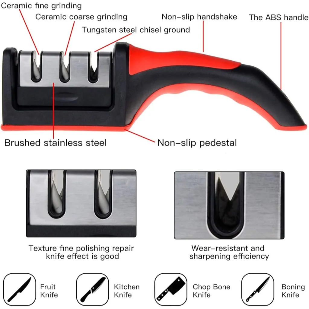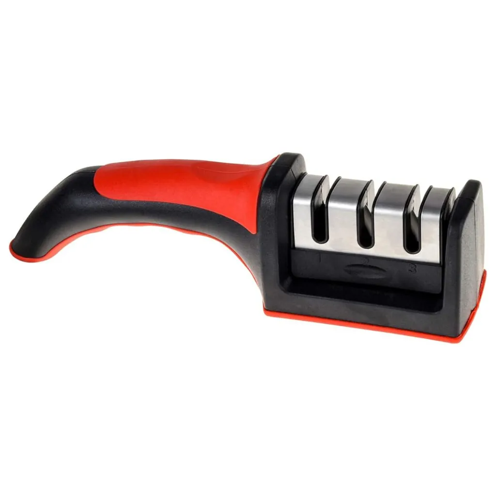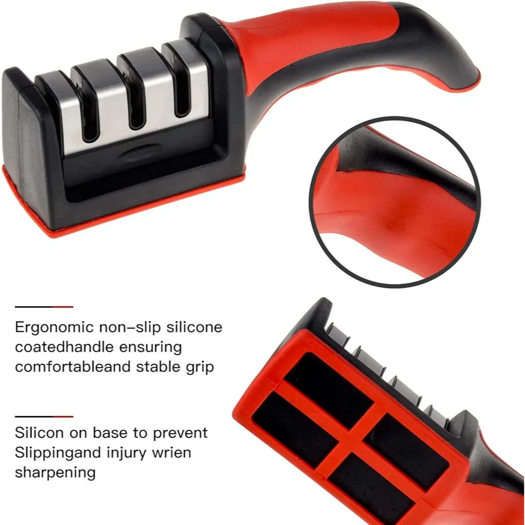 Enhance your kitchen experience with the Premium Manual Knife Sharpener, designed to effortlessly restore the sharpness of your dull blades. Featuring an ergonomic red and black handle for a comfortable grip, this sharpener uses high-quality tungsten steel slots to provide precise sharpening with minimal effort. Packaged in a sturdy box, it includes clear instructions for easy use, making it ideal for both novice and experienced cooks. The compact design ensures it fits perfectly in any kitchen drawer or countertop, while its durable construction guarantees long-lasting performance. Perfect for knives of various sizes, this tool is a must-have for maintaining a well-equipped kitchen.