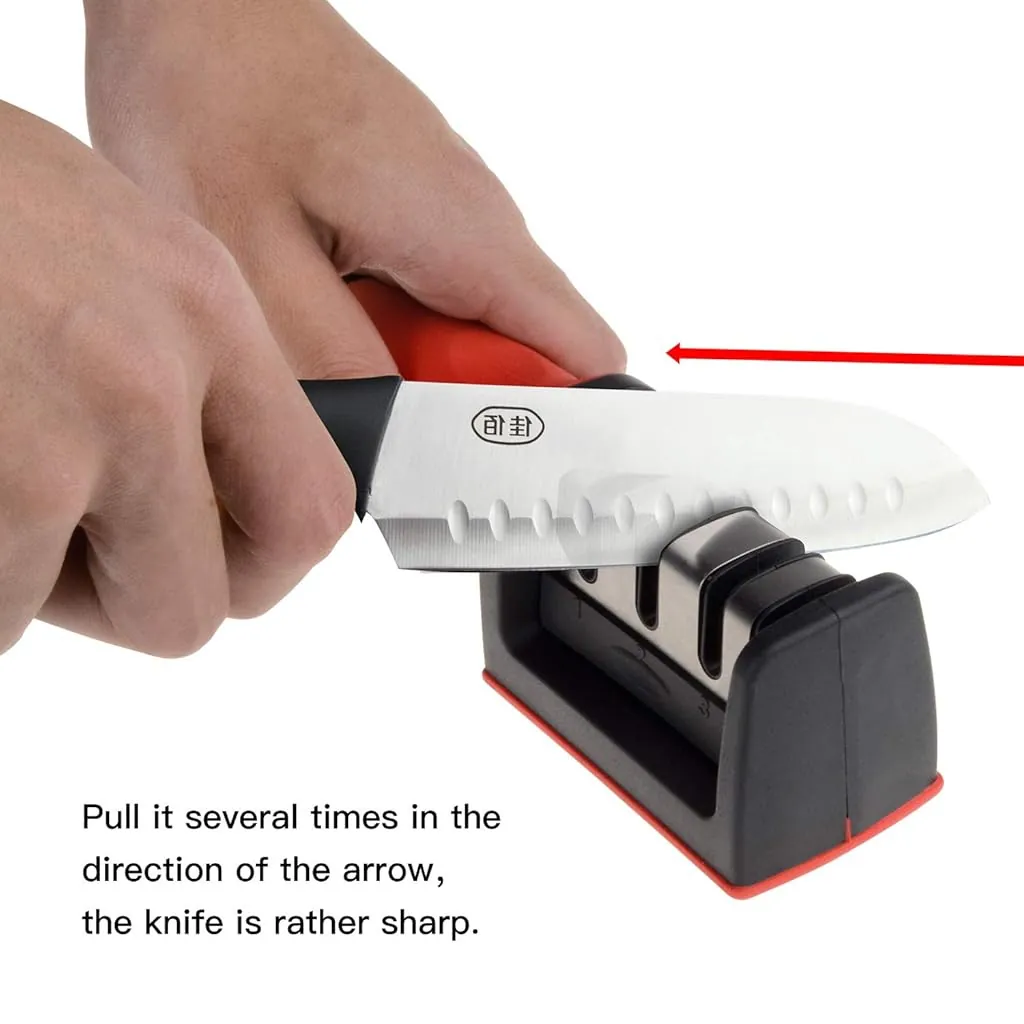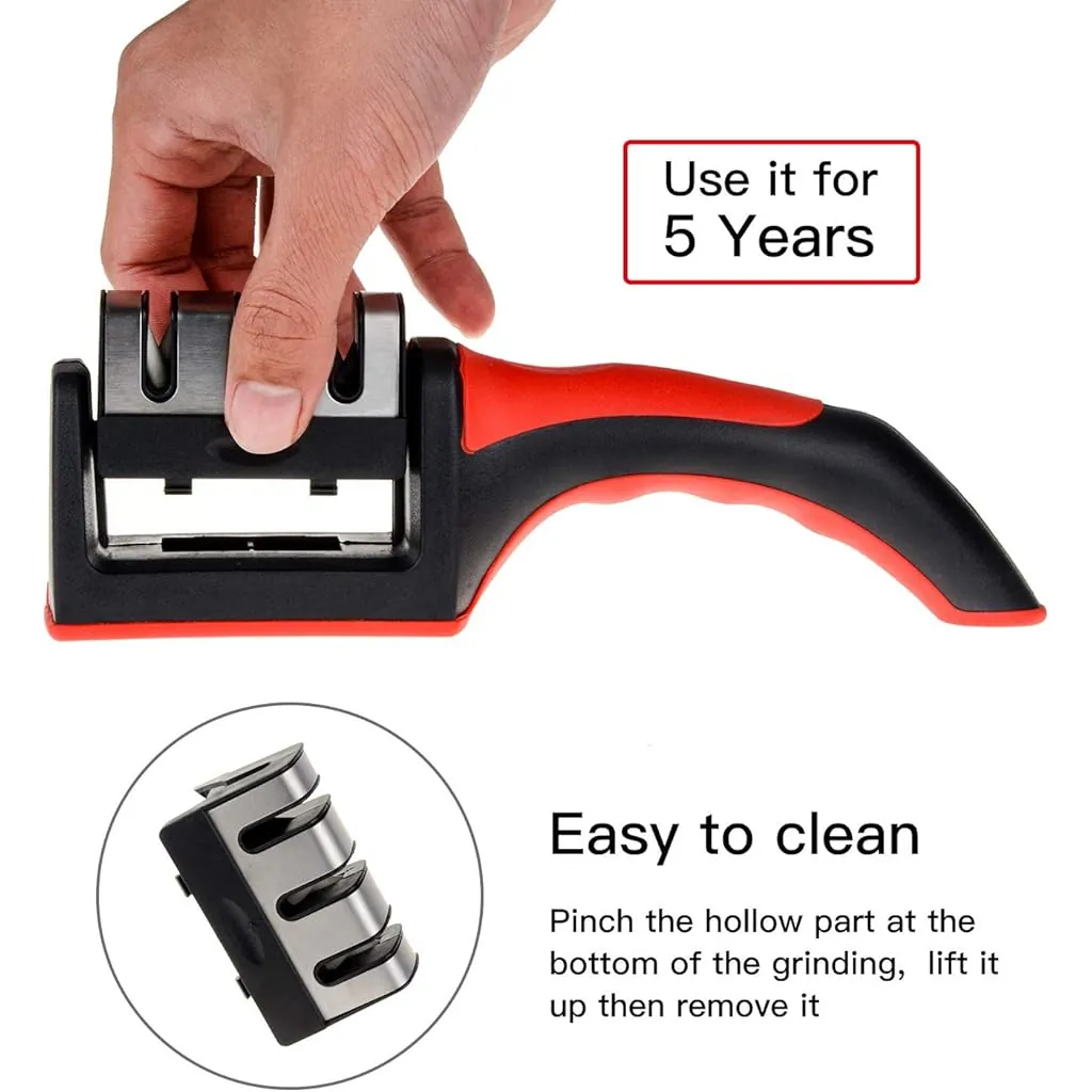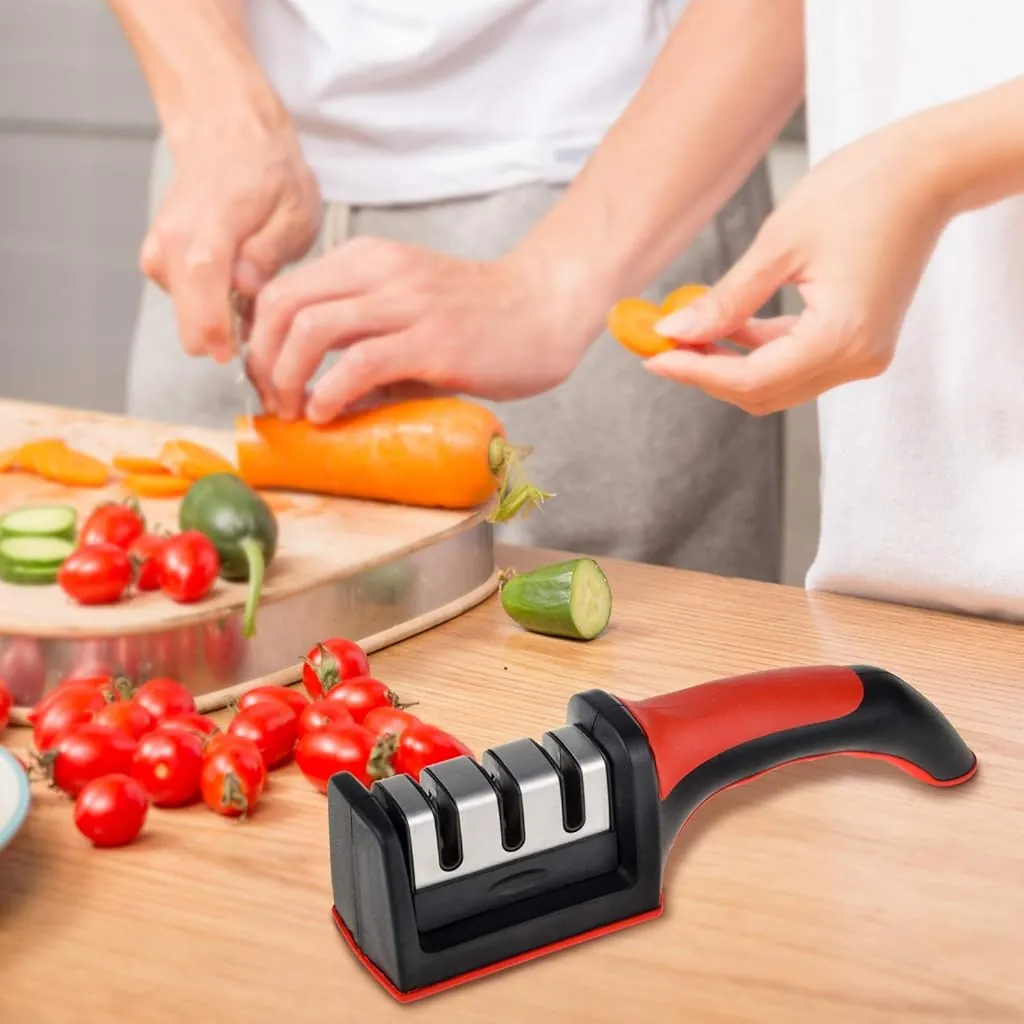 Enhance your kitchen experience with the Premium Manual Knife Sharpener, designed to effortlessly restore the sharpness of your dull blades. Featuring an ergonomic red and black handle for a comfortable grip, this sharpener uses high-quality tungsten steel slots to provide precise sharpening with minimal effort. Packaged in a sturdy box, it includes clear instructions for easy use, making it ideal for both novice and experienced cooks. The compact design ensures it fits perfectly in any kitchen drawer or countertop, while its durable construction guarantees long-lasting performance. Perfect for knives of various sizes, this tool is a must-have for maintaining a well-equipped kitchen.