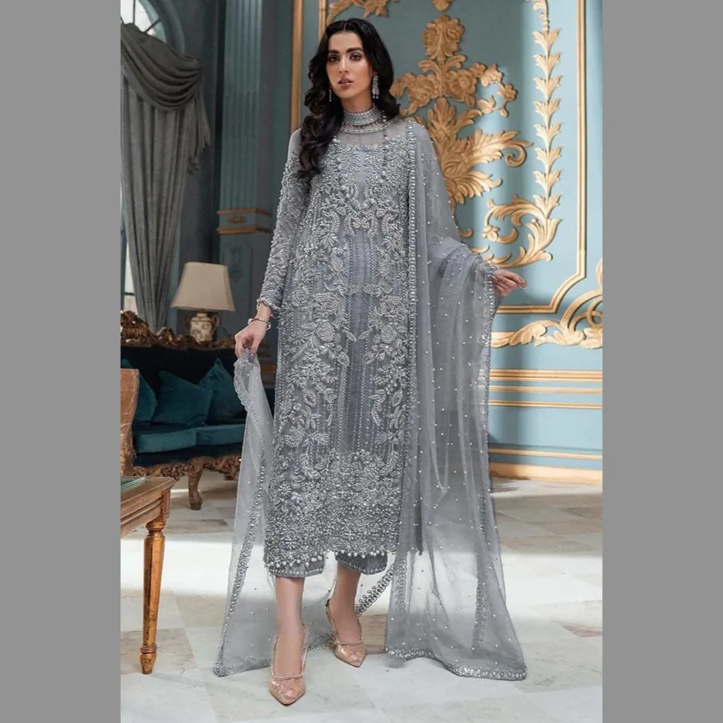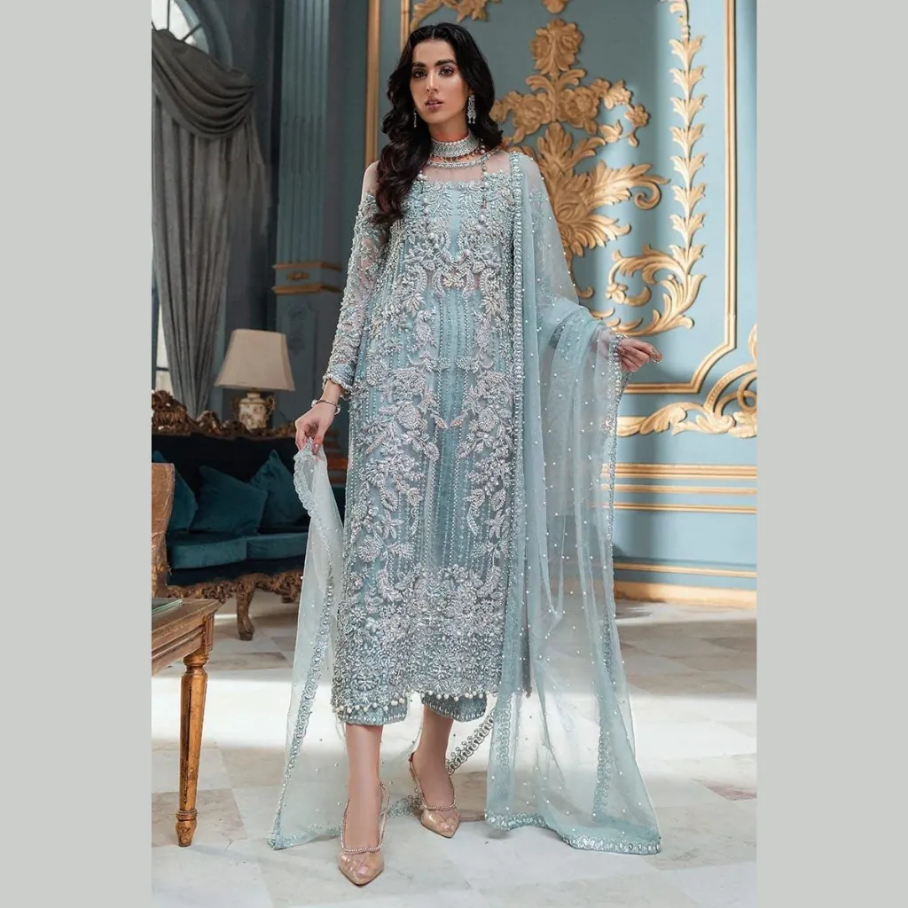 Unveil timeless luxury with the LAAM Net Embroidered & Sequence Luxury Unstitched 3PC, a masterpiece of intricate detailing and premium craftsmanship. Designed for festive and wedding wear, this ensemble combines traditional elegance with modern sophistication.