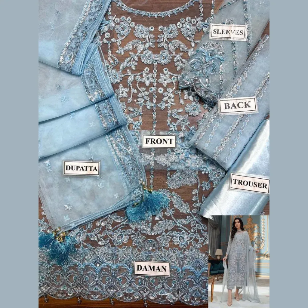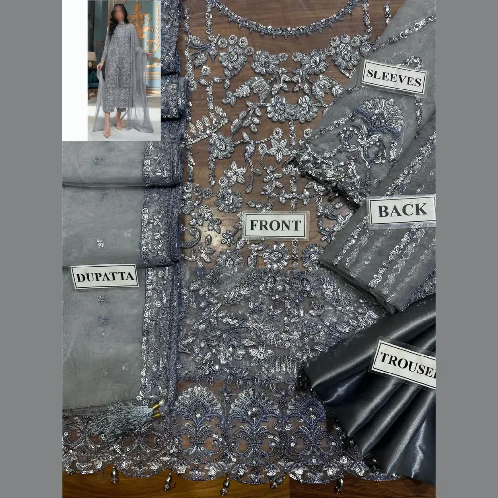 The front features delicate net embroidery with sequence work and pearl embellishments, giving a regal appeal. A beautifully designed cutwork daman with fancy tussles adds finesse and charm. The embroidered & sequined back and sleeves with pearl detailing create a graceful flow, while the silk trouser adds comfort and class. To complete the look, the outfit comes with a ready-to-wear net embroidered & sequined dupatta, making it an effortless yet luxurious statement piece.