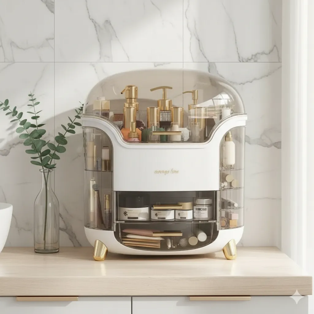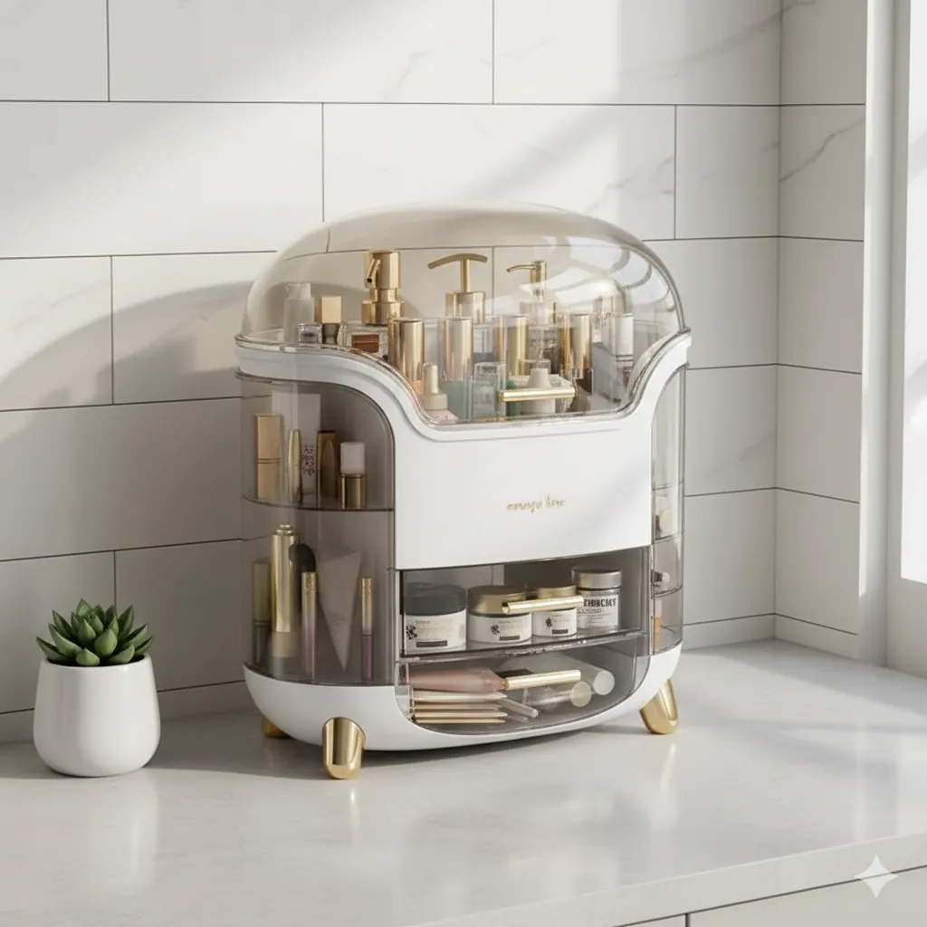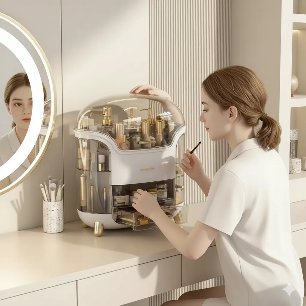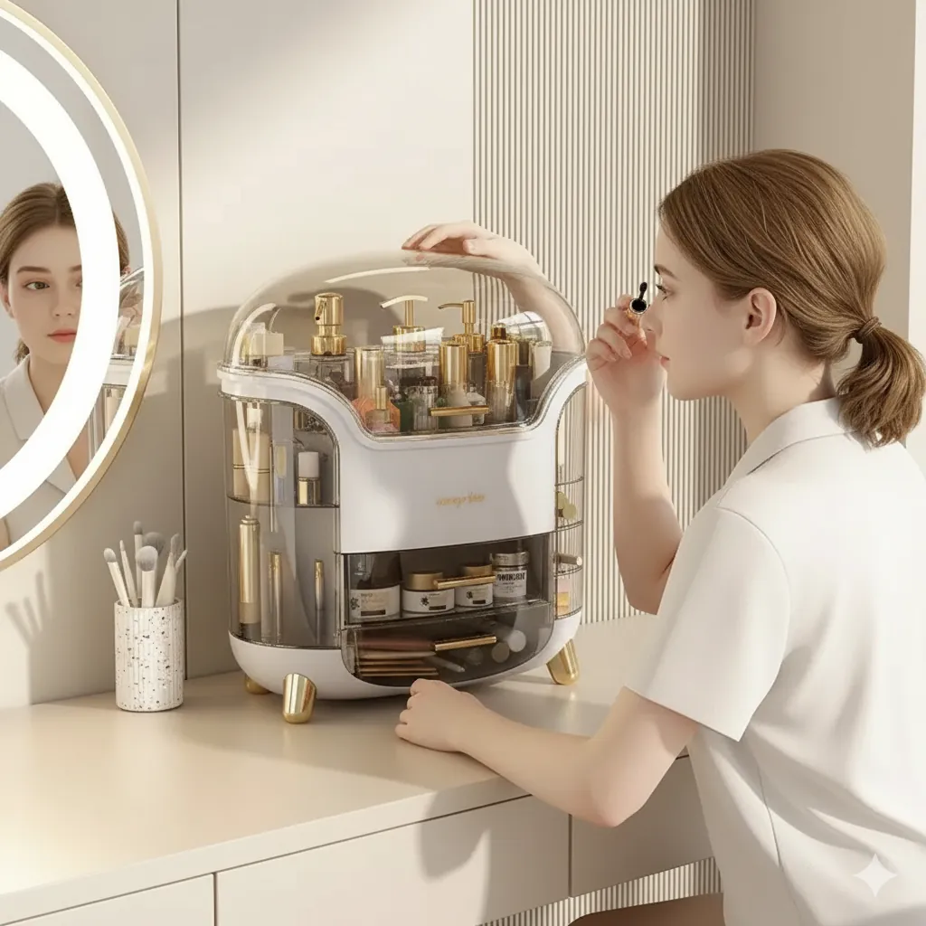 Crafted from high-quality, durable materials, this organizer is built to last and protect your valuable collection. The large, transparent dustproof dome cover is the hero of this design, effortlessly lifting to reveal all your beauty essentials while shielding them from dust, moisture, and sunlight. This keeps your cosmetics clean, hygienic, and ready for use.