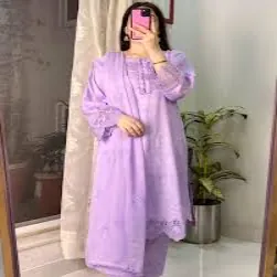 Lavender Unstitched 3-Piece Suit with Embroidered Dupatta and Cutwork Patches. This is a stunning, unstitched lavender 3-piece suit, designed for a look of pure elegance and sophistication. This ensemble is a complete package, providing all the components to create a beautifully detailed and coordinated outfit. The shirt fabric is a solid color, which serves as a perfect canvas for the intricate details on the patches. A beautifully crafted, separate daman patch with delicate cutwork-style embroidery is provided to be attached to the hemline, and a separate embroidered sleeve patch adds a refined touch to the cuffs. The suit is complemented by a soft, luxurious embroidered dupatta in the same lavender shade, featuring subtle, self-colored embroidery throughout, creating a gorgeous monochrome look. The suit is completed with a generous piece of matching fabric for the trousers, allowing you to tailor them to your desired style and fit. This unstitched suit offers a graceful and sophisticated style, perfect for semi-formal gatherings or any occasion where you want to make an elegant statement.