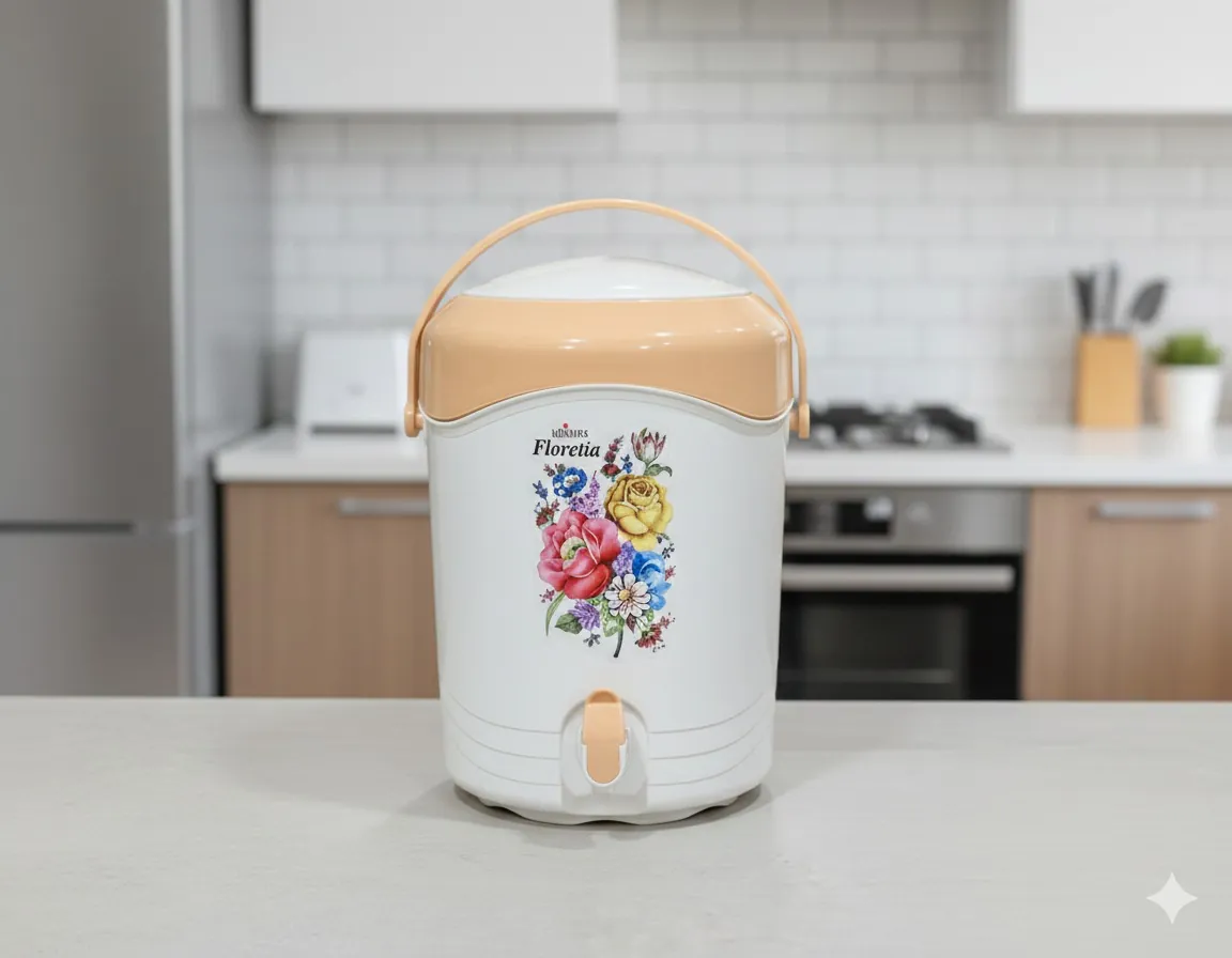 The centerpiece is a large, high-efficiency water cooler equipped with a leak-proof tap and a sturdy carry handle, ensuring your beverages stay refreshingly cold during long summer afternoons or travel. The beige-peach finish combined with the intricate "Floretta" floral motif makes it an exquisite gift for weddings, anniversaries, or housewarming parties. Durable, break-resistant, and BPA-free, this set ensures your food remains fresh, hygienic, and ready to serve at the perfect temperature.