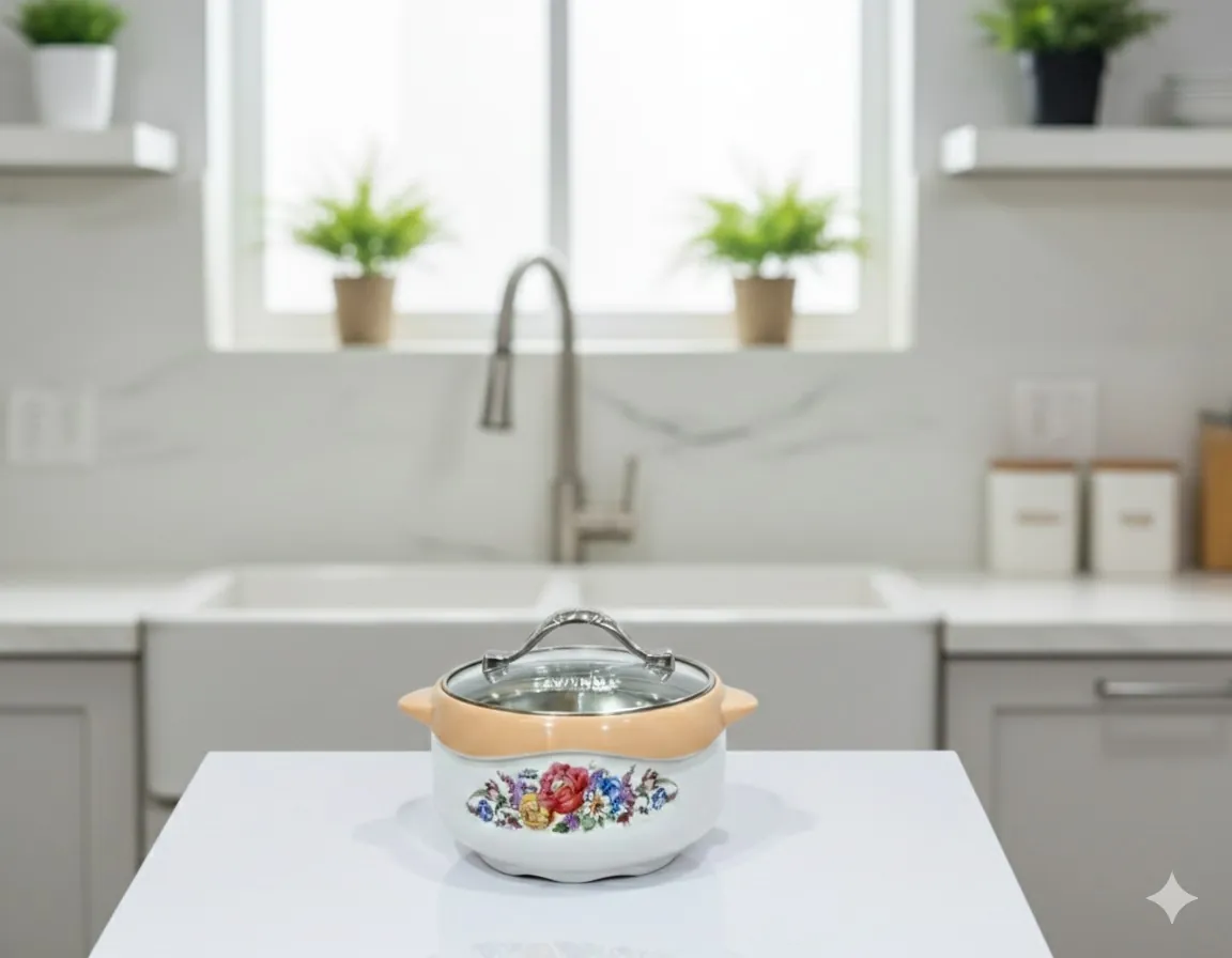 Elevate your dining experience with the Lavinna Floretta 4-Piece Premium Gift Pack. Designed for those who value both style and functionality, this set is a must-have for every modern kitchen. The set includes three double-walled insulated hot pots (Casseroles) that utilize high-quality polyurethane foam to keep your rotis, biryani, and curries hot for up to 6 hours.