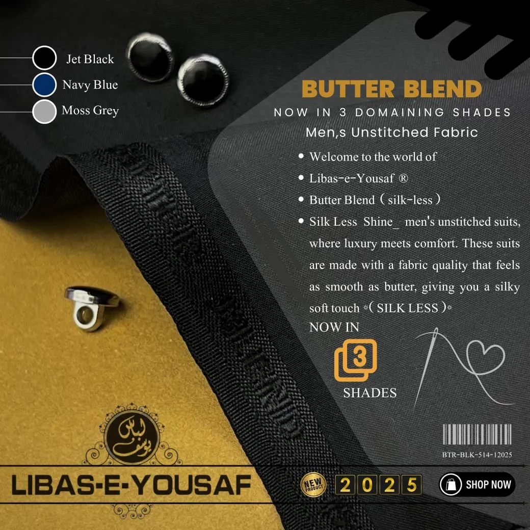 Elevate your wardrobe with Libas-e-Yousaf’s Butter Blend (Silk-Less) 2025 Collection, where luxury meets unparalleled comfort. These premium unstitched men’s suits are crafted from high-quality Boski fabric, offering a silky-soft touch that feels as smooth as butter, without any silk. Designed for the modern man, this collection combines timeless sophistication with everyday ease, making it ideal for all seasons. Available in 3 dominating shades, the 4-meter fabric (52-54 inches wide) allows you to tailor a unique style that reflects elegance and comfort. Each package includes a branded box, tags, cards, ribbon, and metal molded buttons, ensuring a premium experience. Perfect for formal occasions or casual elegance, shop Libas-e-Yousaf Butter Blend suits online today for a refined look. Note: Delivery not included.