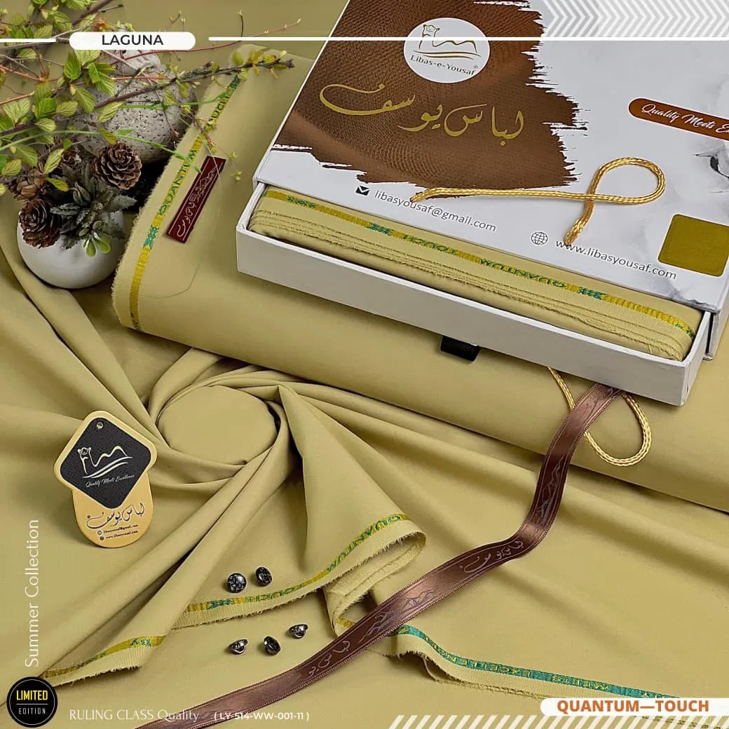 Introducing Libas-E-Yousaf's Premium Unstitched Wash'n Wear Fabric Collection, a timeless blend of tradition, elegance, and modern craftsmanship. Available under sub-brands like Quantum Touch, Eco Soft, Fusion Trove, Royal Tag, and Q Star, this collection is tailored for the discerning man who values quality and versatility. Made from a high-quality blended fabric, it offers a lightweight yet durable texture, ensuring comfort across all seasons. The fade-resistant, vibrant colors maintain their brilliance over time, making it ideal for both formal occasions and daily wear. With a generous 4-meter length and 52-54 inches width, this unstitched fabric allows for customized tailoring to suit your style. Packaged in a branded box with tags, cards, ribbon, and metal-molded buttons, this collection combines sophistication with practicality, keeping you cool in summer and warm in winter.