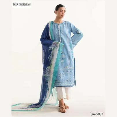 Step into the season with this beautiful Zara Shahjahan Luxury Lawn three-piece embroidered suit (likely part of the same collection as the previous one). The soft light blue lawn shirt showcases lovely floral embroidery and subtle embellishments, creating a refreshing look. The dupatta features a graceful blend of blues and white with floral and potentially abstract designs, adding an airy feel. It comes with comfortable white trousers. Perfect for sunny days, this premium collection outfit combines delicate details with a light and breezy aesthetic.