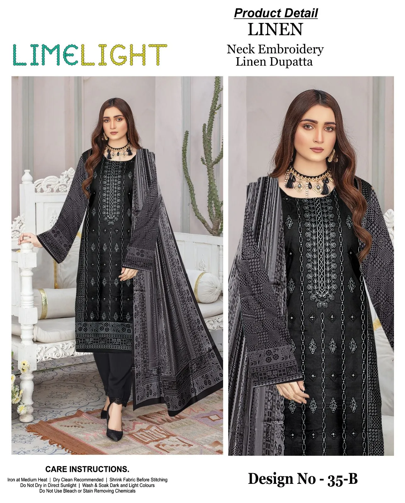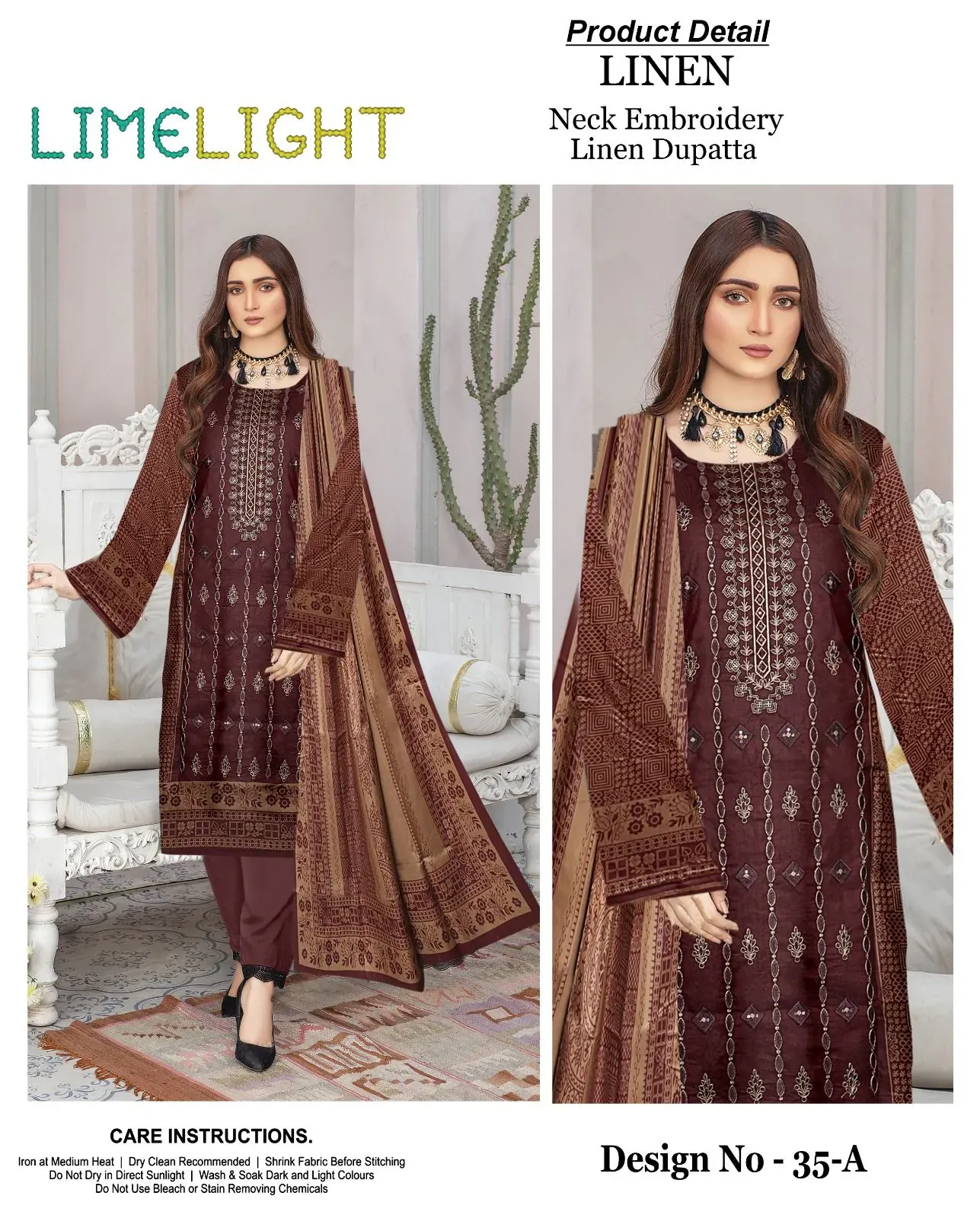 Discover the elegance of the new Limelight Winter Collection with this stunning unstitched 3-piece linen suit. Crafted from high-quality 72/72 linen, this ensemble features a beautifully embroidered front, a digital printed linen dupatta, and a comfortable plain trouser. The rich color palette and intricate design make it a perfect choice for both casual wear and special occasions during the winter season. The breathable linen fabric ensures comfort and warmth, while the detailed embroidery adds a touch of traditional Pakistani craftsmanship. Shop this latest fashion statement from Limelight and elevate your winter wardrobe.