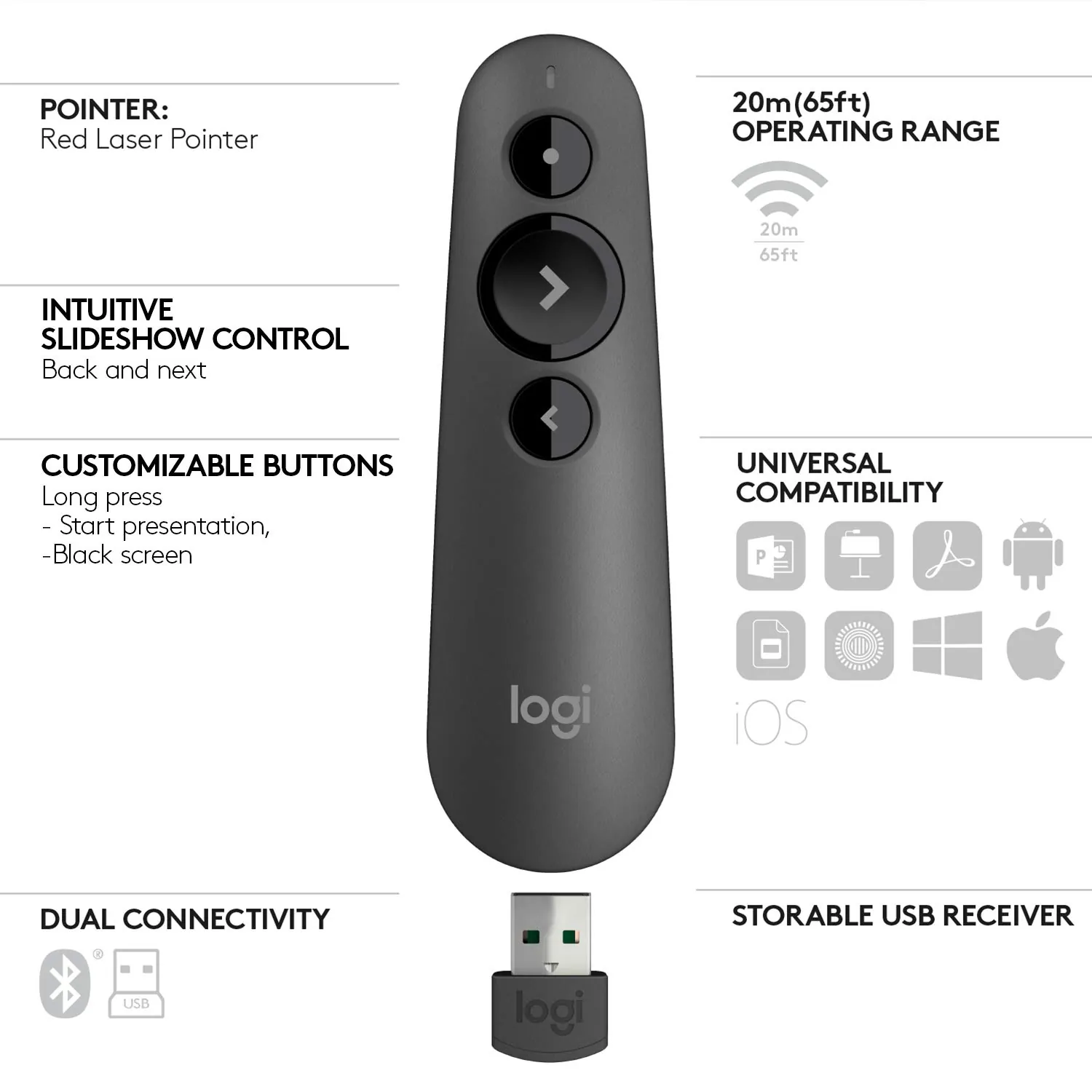 Elevate your presentation game with the Logitech R500 Laser Presentation Remote. This versatile device offers dual‑connectivity: pair via Bluetooth Low Energy or plug in the nano USB receiver — giving you freedom and simplicity across Windows®, macOS®, iOS and Android platforms. With a range of up to 20 metres (approx. 65 feet), you can walk confidently around the room while controlling your slides and highlighting key points using its bright red Class 2 laser pointer. The remote features three intuitive buttons — advance, back and laser — housed in a comfortable rubber‑touched body with textured buttons for secure grip and confident use. Its long‑life AAA battery supports up to 12 months of typical use (even more if the laser pointer is disabled when the battery is low)