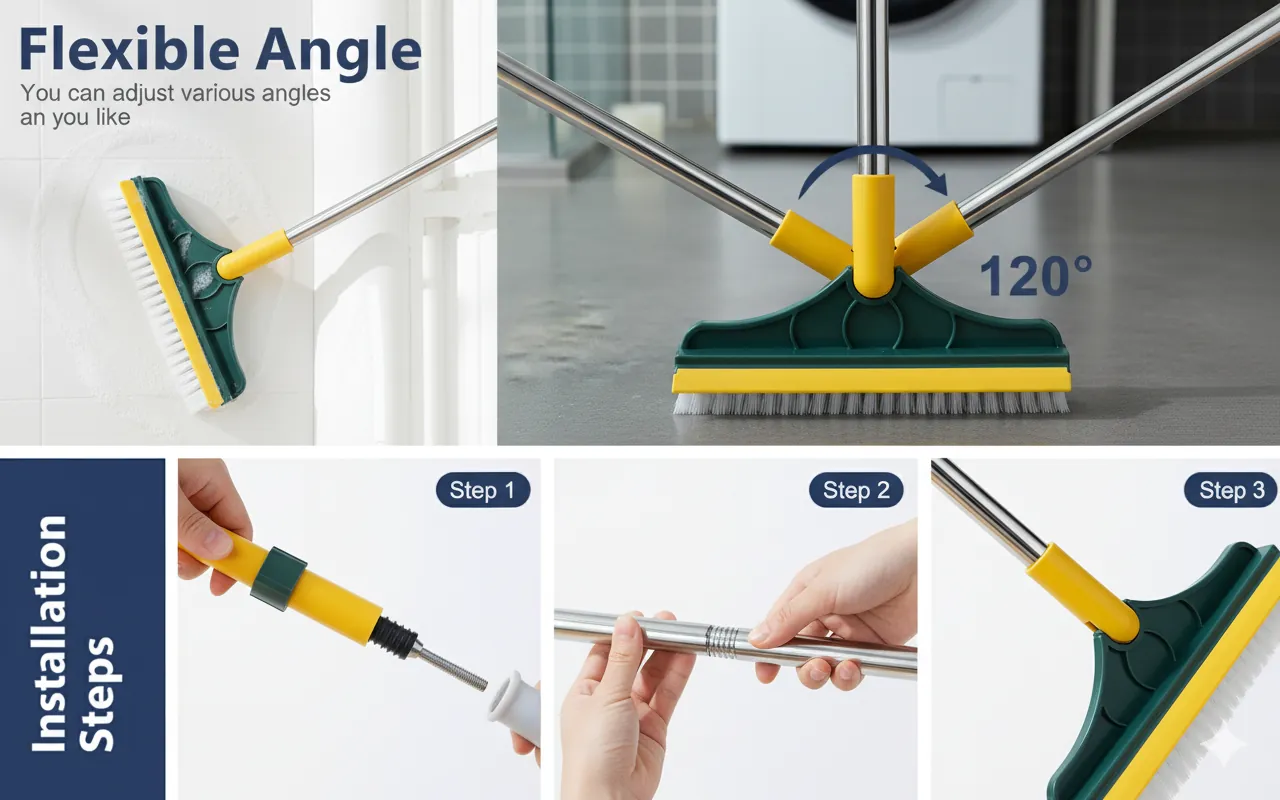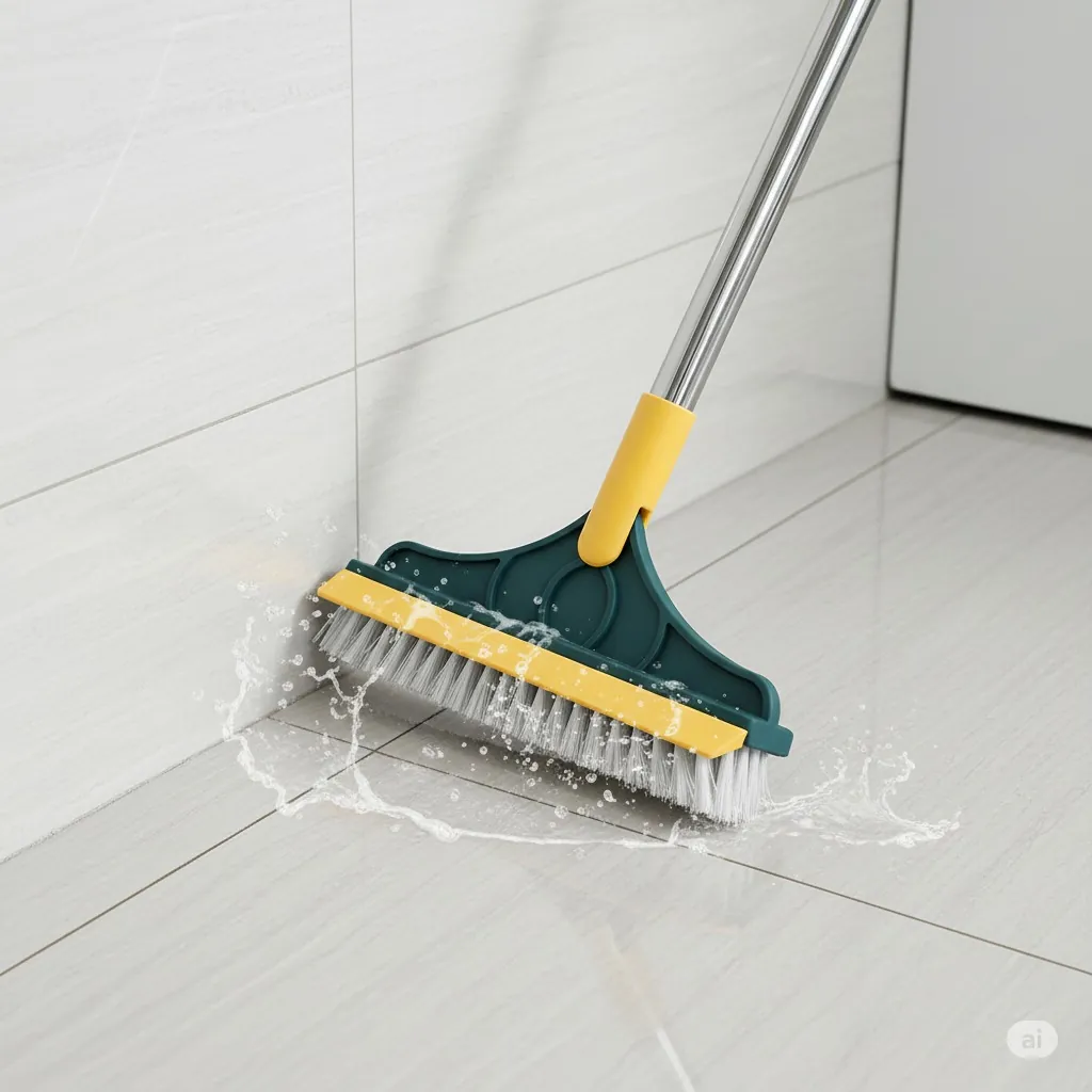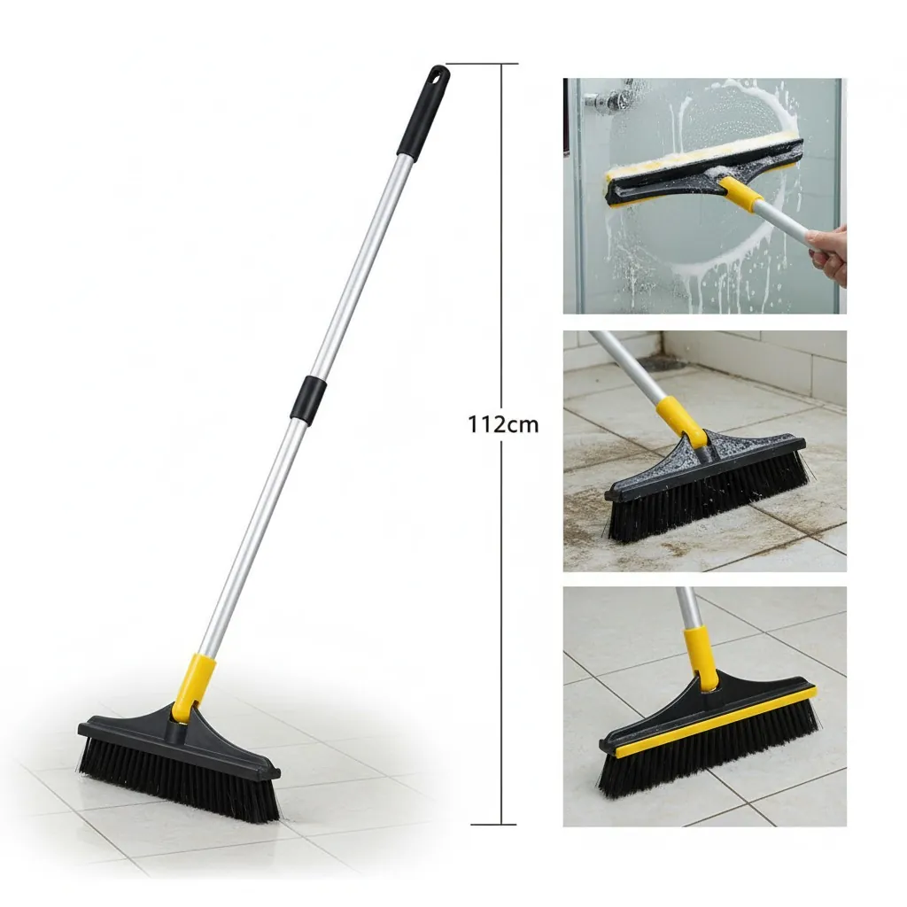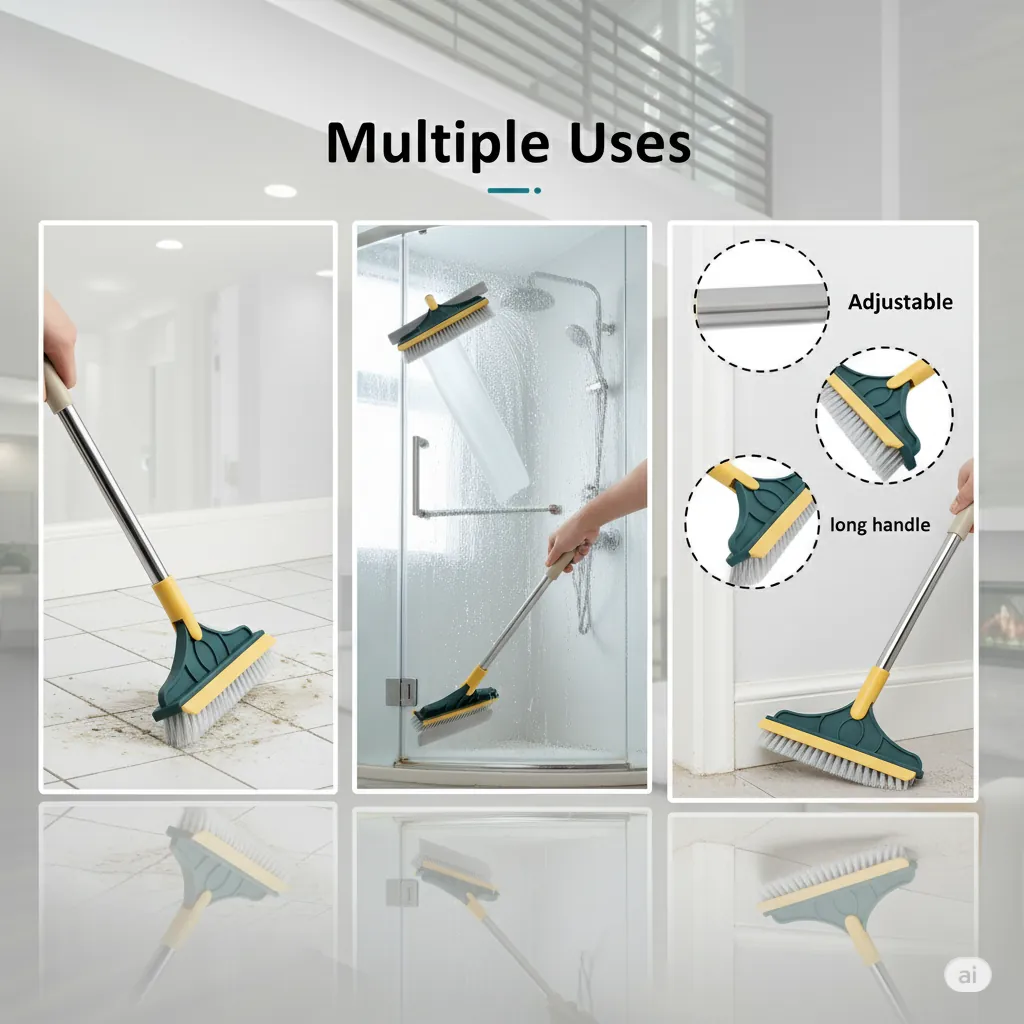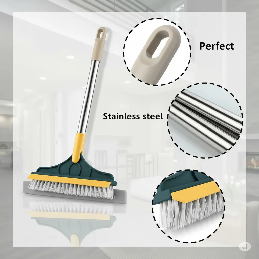 The Ultimate 2-in-1 Cleaning Tool: Scrub and Scrape! Revolutionize your cleaning routine with the 2-in-1 Floor Scrub Brush with Squeegee. This versatile "two-in-one artifact" is engineered to tackle the toughest dirt, grime, and dirty water in your home. It features a dense, V-shaped stiff-bristle brush on one side for deep scrubbing, and a high-quality rubber squeegee/scraper on the other to effectively wipe away liquid and foam.Ergonomic and Effective: The brush head is often designed to rotate (e.g., 120∘) and is set at a labor-saving 45∘ angle, allowing you to reach and clean challenging areas like grout lines, shower corners, window tracks, and high/low gaps without bending or straining your back.Durable & Multi-Use: Constructed with a rust-resistant stainless steel handle and durable PP plastic, this tool is built for longevity. Perfect for use on multiple surfaces including tile floors, bathroom walls, patios, garages, and kitchen areas. Effortlessly remove stubborn dirt and leave your surfaces dry and streak-free.