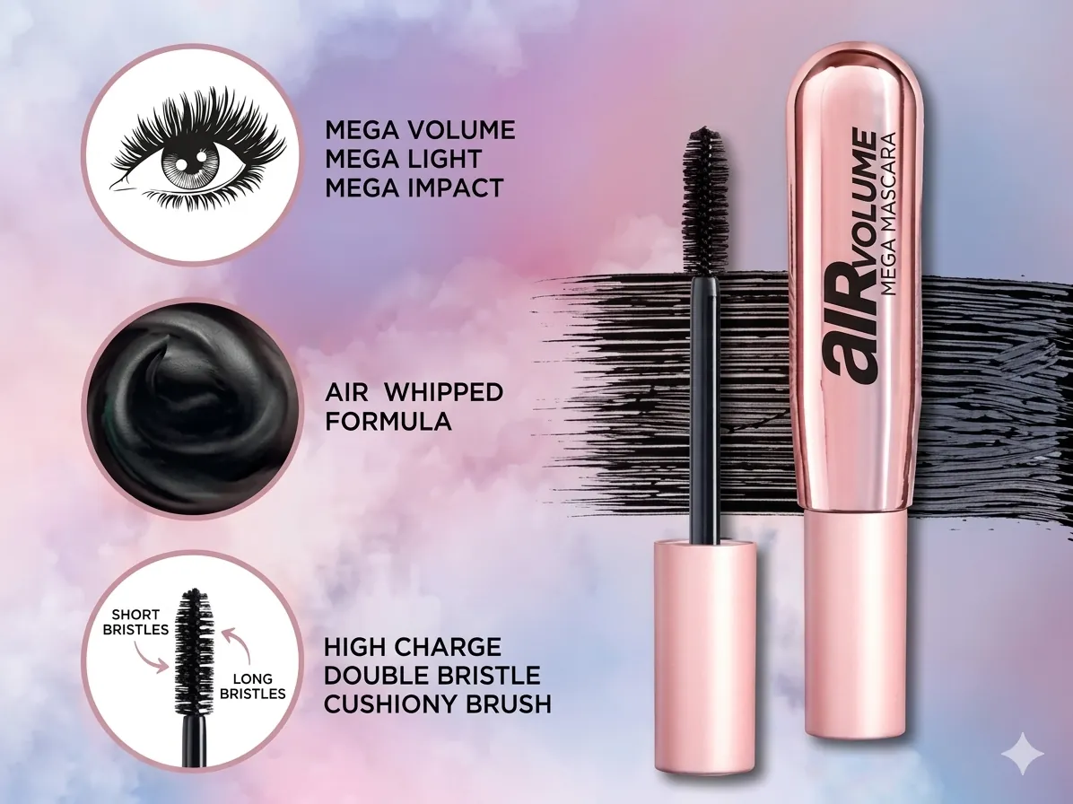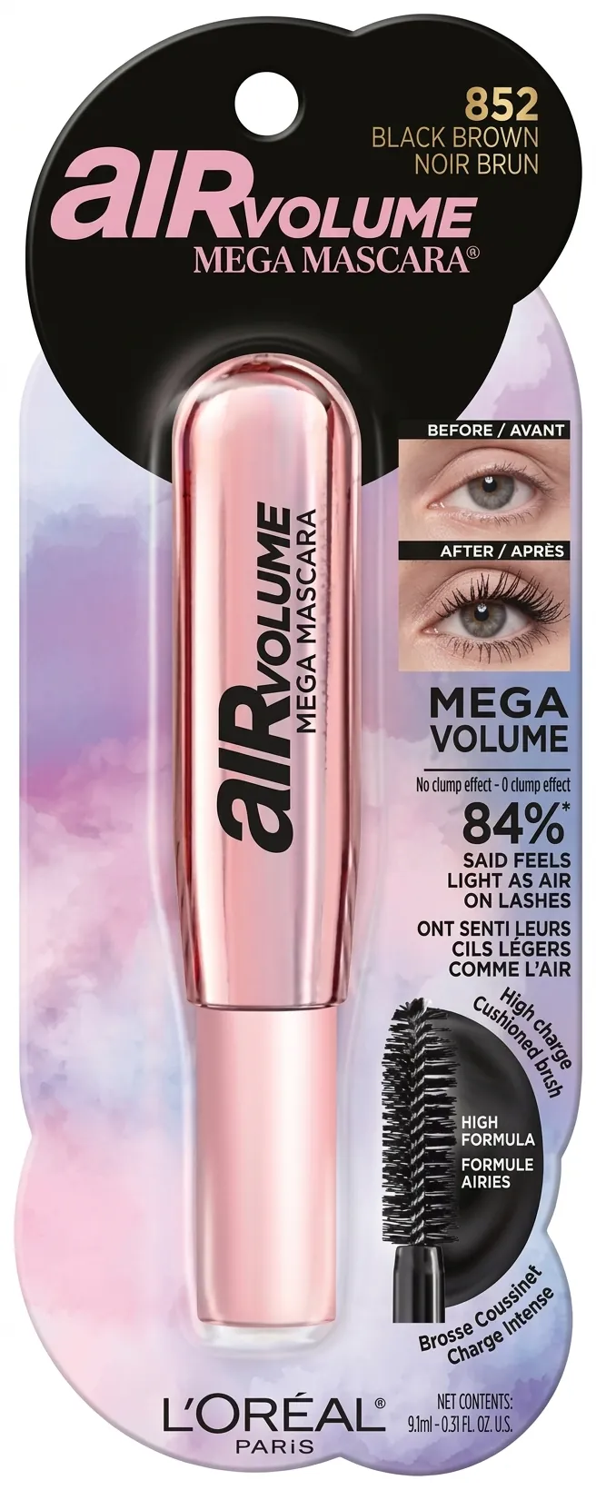 L'Oreal Paris Air Volume Mega Mascara defies the rules of traditional volumizing mascaras. Most high-volume formulas can feel heavy and stiff, but the Air Volume technology uses air-injected texture to create a multiplying effect that stays weightless. The mascara features a unique cushiony double-bristle brush: the short bristles capture and load lashes deep at the roots, while the long bristles distribute the intense black formula evenly for a fan-like finish. Its pink metallic, balloon-shaped packaging is designed to protect the airy formula, ensuring every application is as fresh and effective as the first. It is hypoallergenic and ophthalmologist-tested, making it safe for sensitive eyes and contact lens wearers.