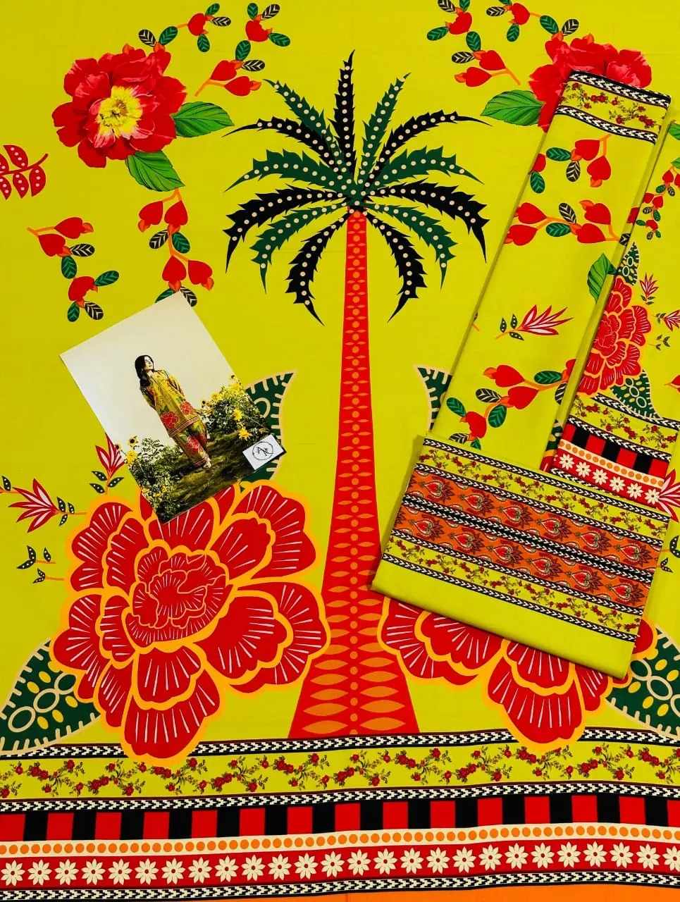 personalized and perfect fit. The vibrant, eye-catching print features large floral and palm tree motifs on a bright yellow background, with a striking contrasting border. With a 100% quality guarantee, this premium set promises both durability and luxurious feel, making it an ideal addition to your wardrobe.