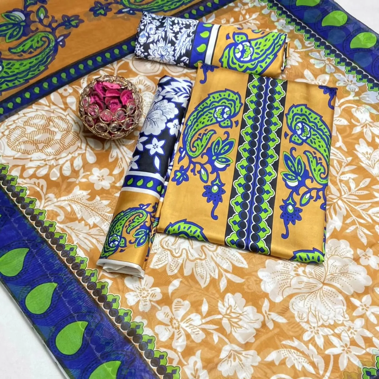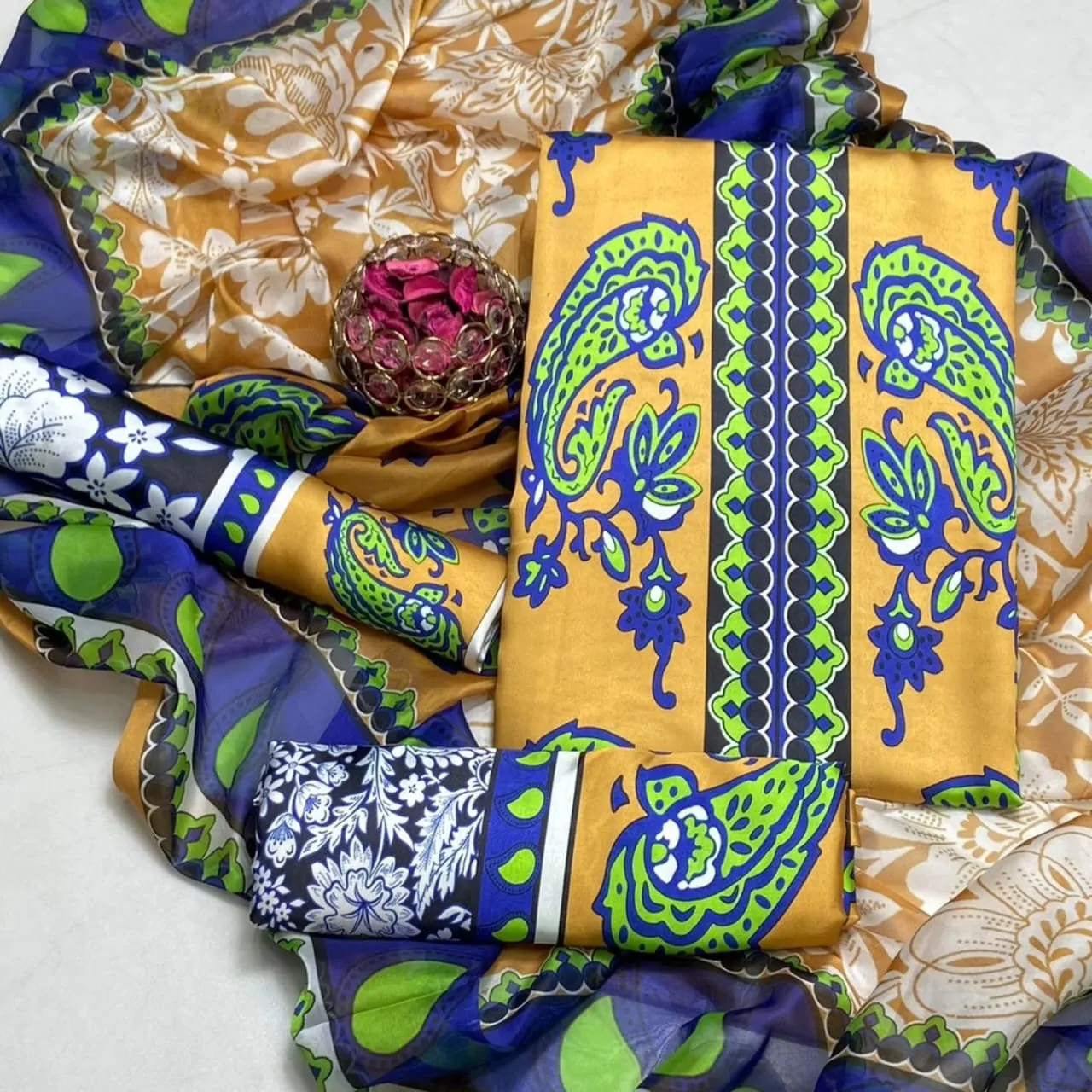 Lulusar 3-Piece Unstitched Digital Printed Silk Suit | Mustard Yellow & Blue Paisley | Party Wear Collection' Make a bold and elegant statement at your next special occasion with this exquisite unstitched 3-piece suit from Lulusar. The entire ensemble is crafted from lustrous, high-quality silk, offering a beautiful drape and a luxurious feel. The highlight of this suit is its vibrant digital print, featuring large, artistic paisley motifs on a rich mustard-yellow base, accented with striking royal blue and lime green.