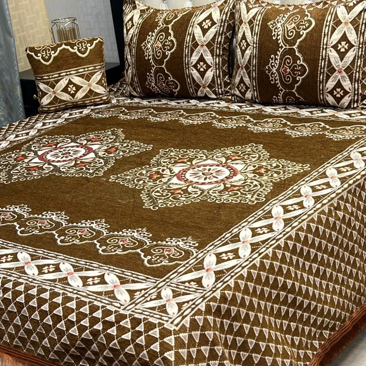 Luxury 4Pc Velvet Jacquard King Size Bedsheet Set – Premium Embroidered Design with Pillow & Cushion Covers (Multiple Colors)