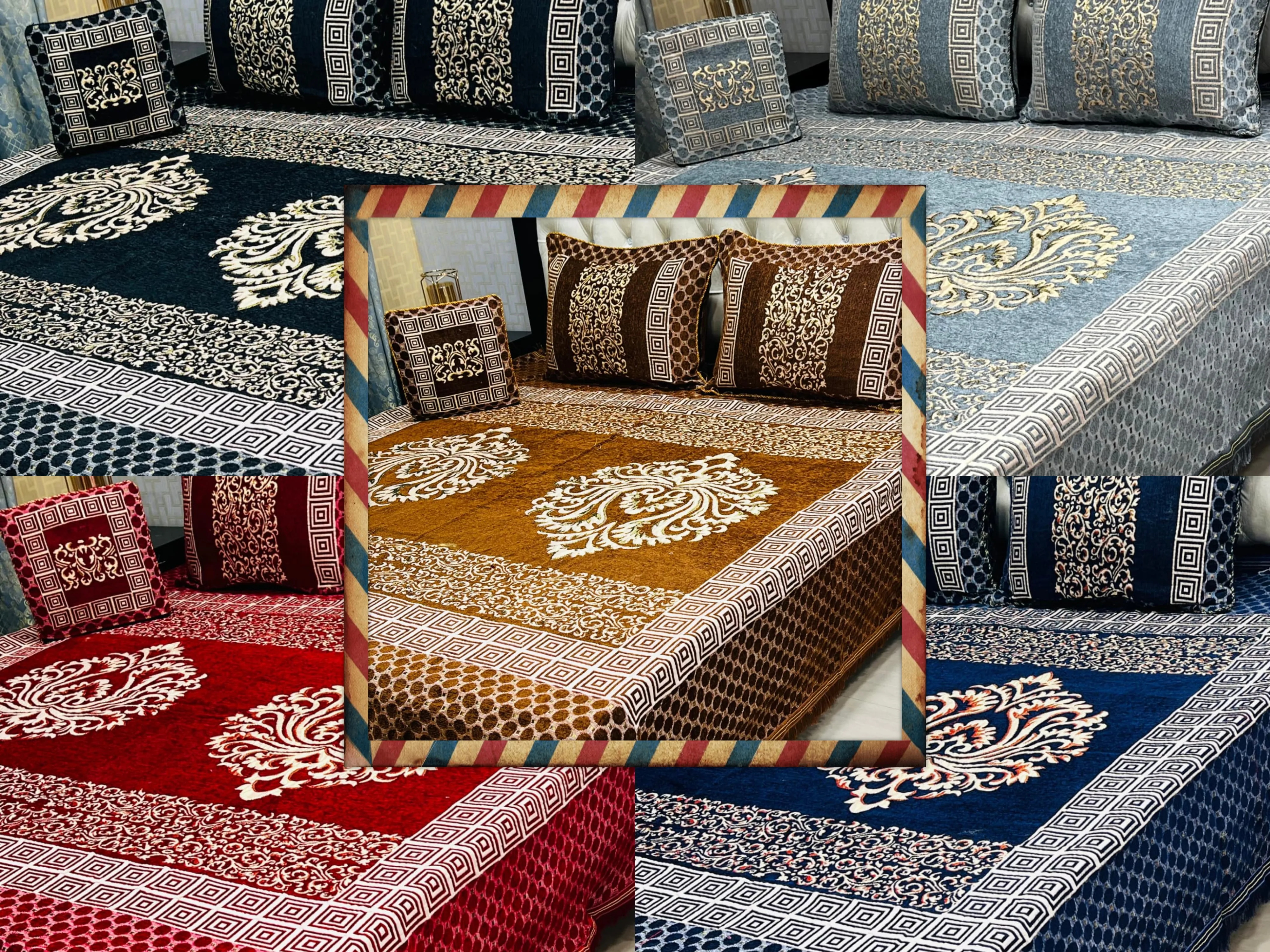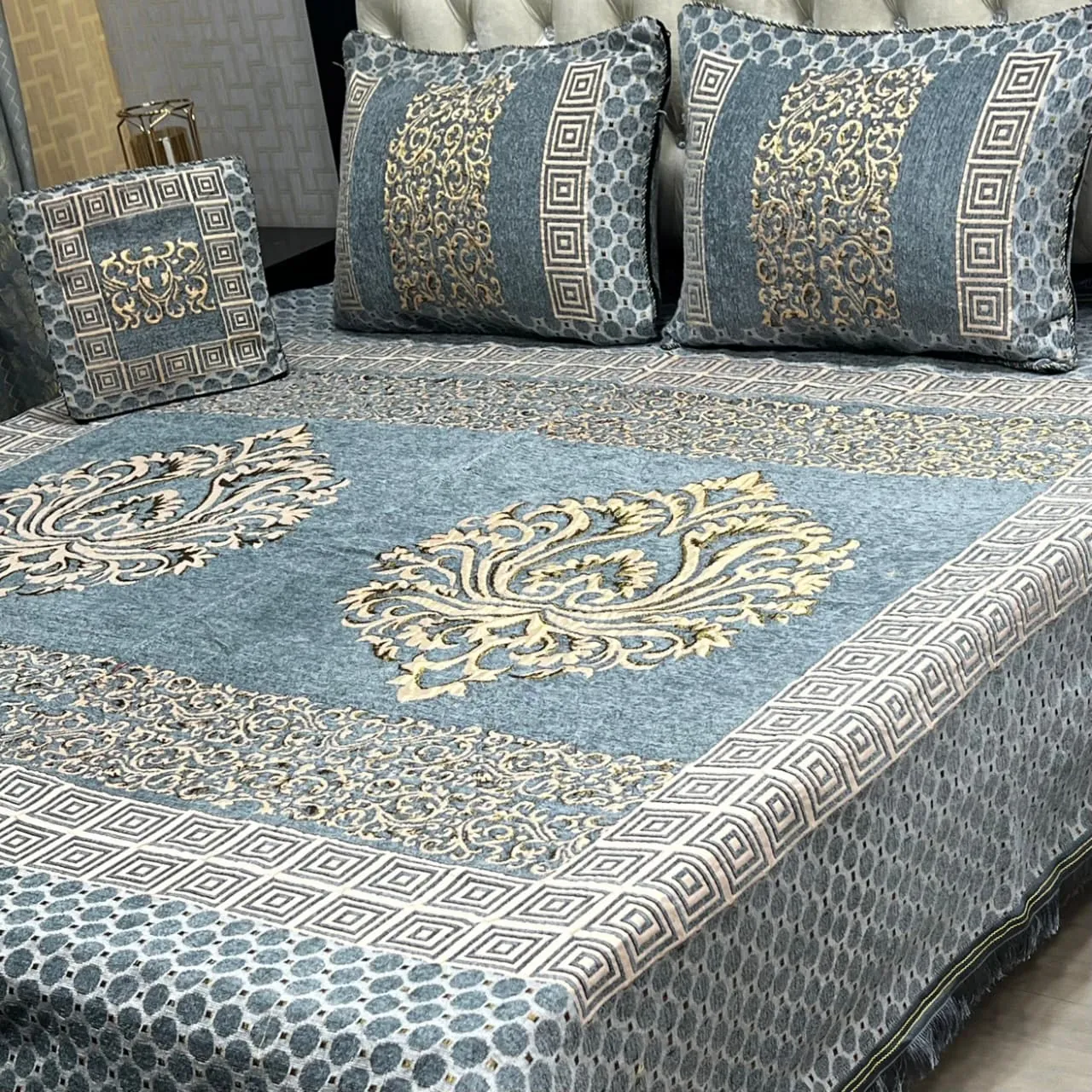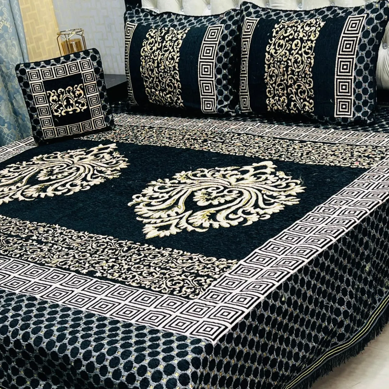 Luxury 4Pc Velvet Jacquard King Size Bedsheet Set – Traditional Royal Pattern | 1 Bedsheet + 2 Pillow Covers + 1 Cushion Cover | Soft, Durable & 100% Color Guarantee