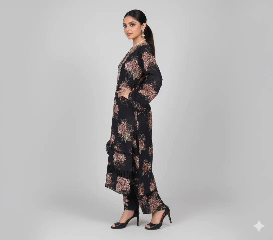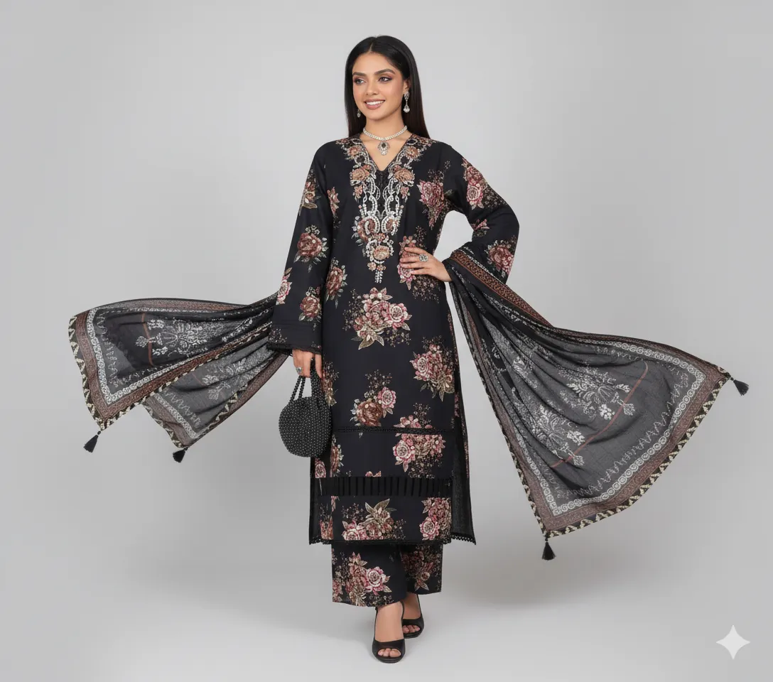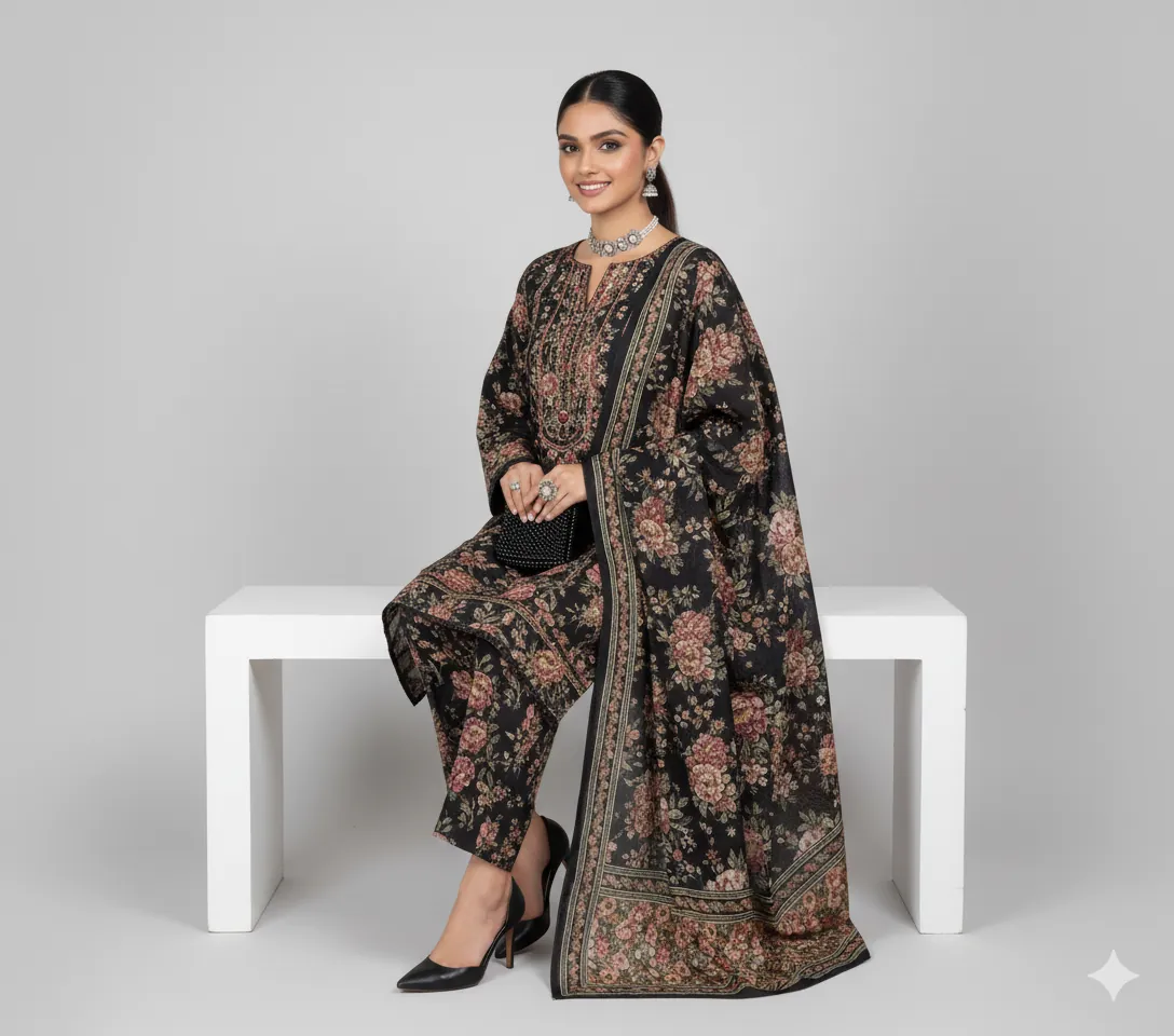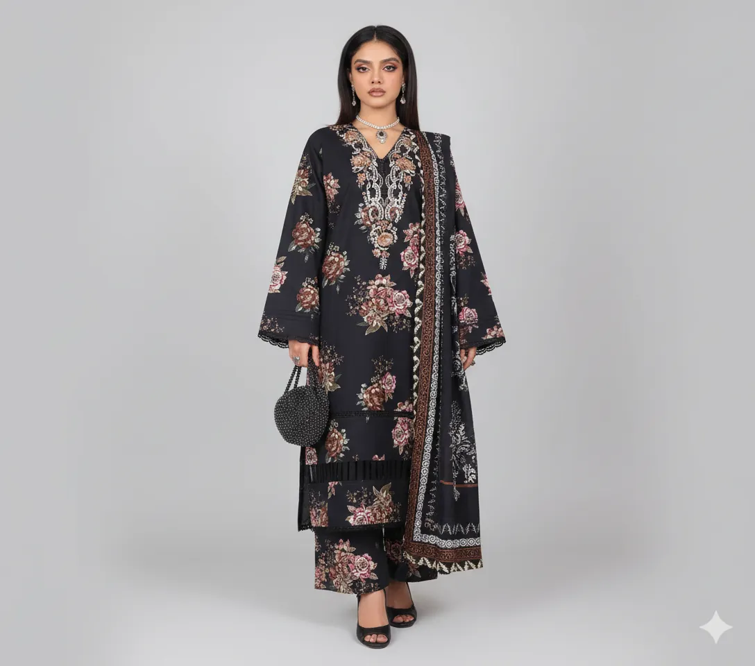 The set is elevated by a beautiful Printed Modal Shawl. This warm wrap features a striking Black and White Paisley/Ethnic Border Print that perfectly complements the floral shirt. Ideal for formal wear, winter weddings, or stylish daily wear, this suit offers a perfect blend of traditional craftsmanship and modern fashion. Shop now to add this must-have, designer-inspired Khaddar Collection to your wardrobe.