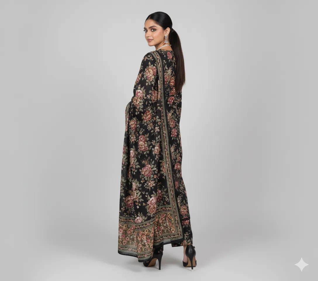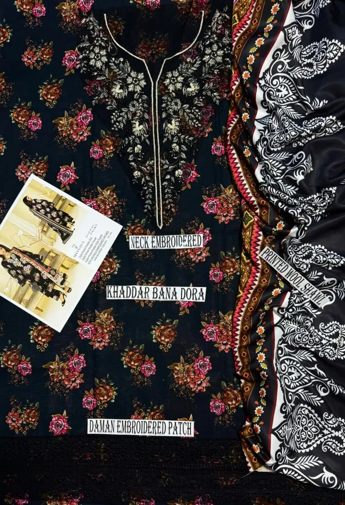 This unstitched ensemble is crafted from premium Khaddar Bana Dora fabric, known for its warm texture and rich drape, making it the perfect choice for the colder season. The shirt features a striking all-over multi-colored floral print set against an elegant deep black base.