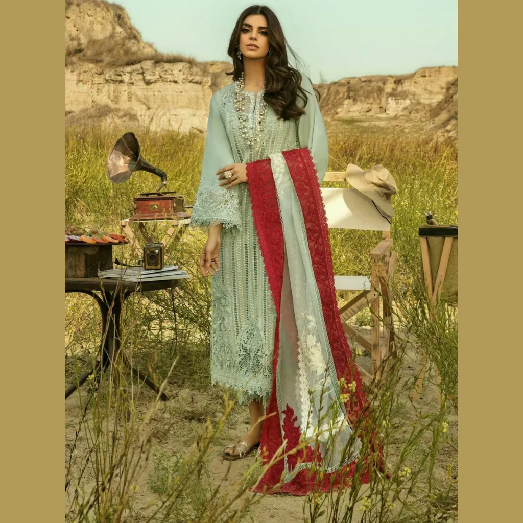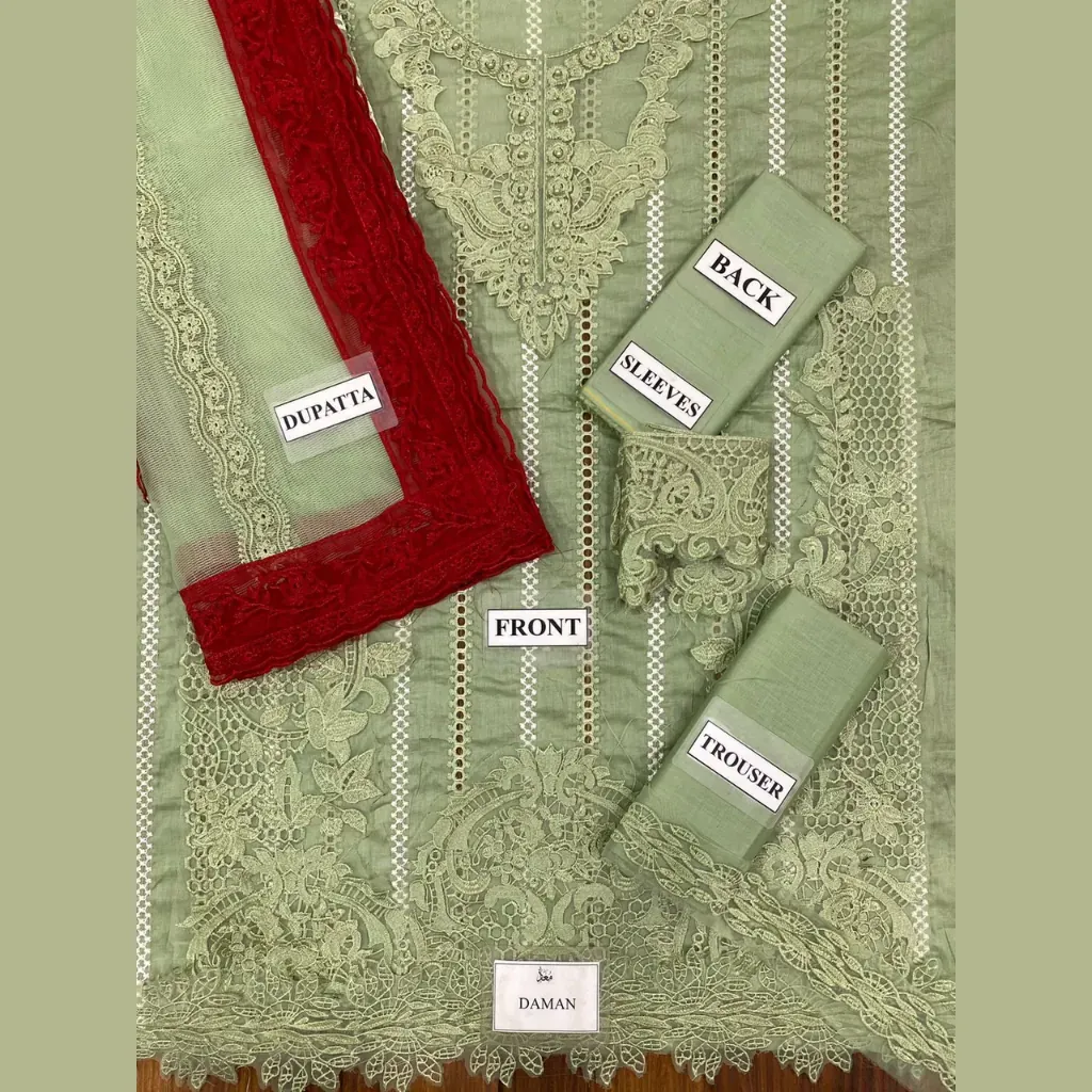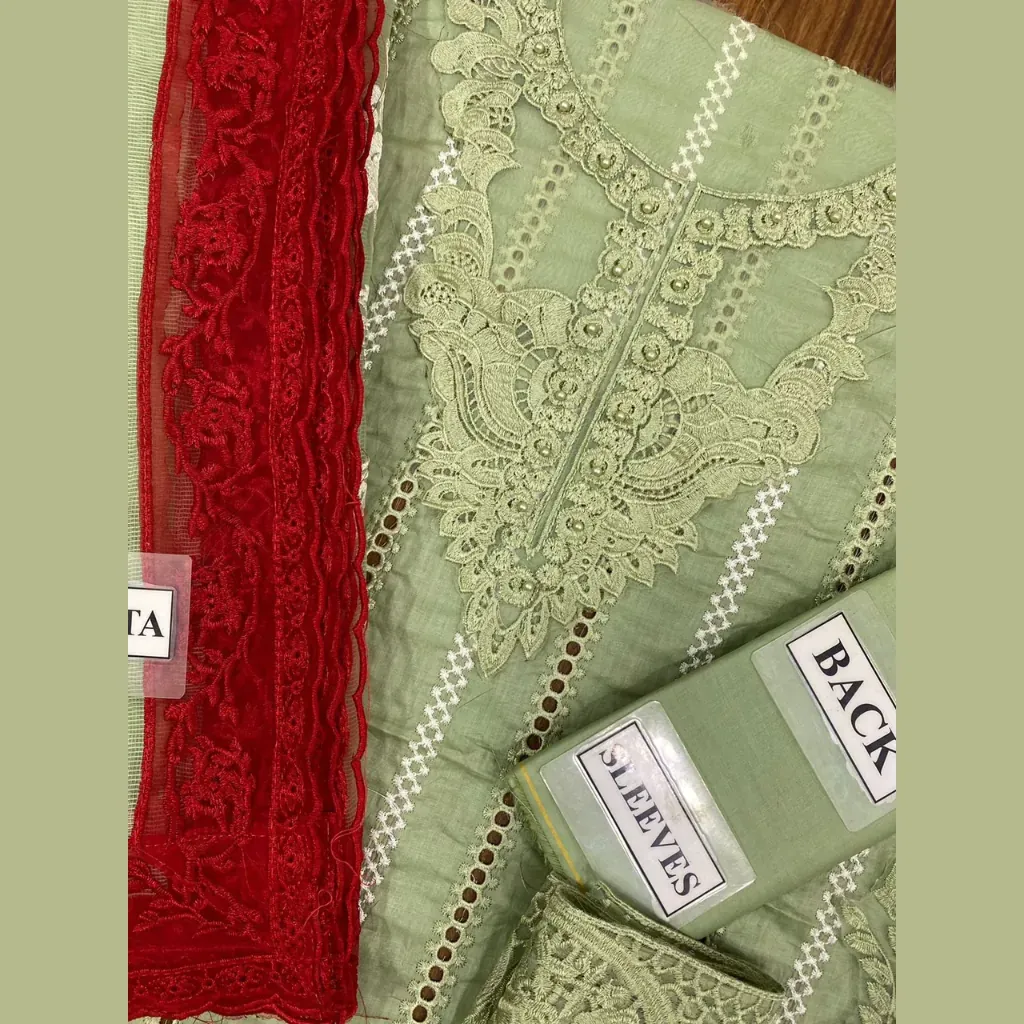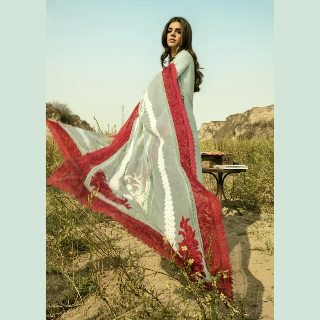 To complete the luxury look, the dupatta is made from embroidered khaddi net, finished with organza borders, making it the highlight of the suit. Whether you’re dressing for a wedding, a festive event, or a formal gathering, this luxury chikankari embroidered lawn cotton suit by Crimson ensures a stunning presence with its classic embroidery and premium fabric quality.