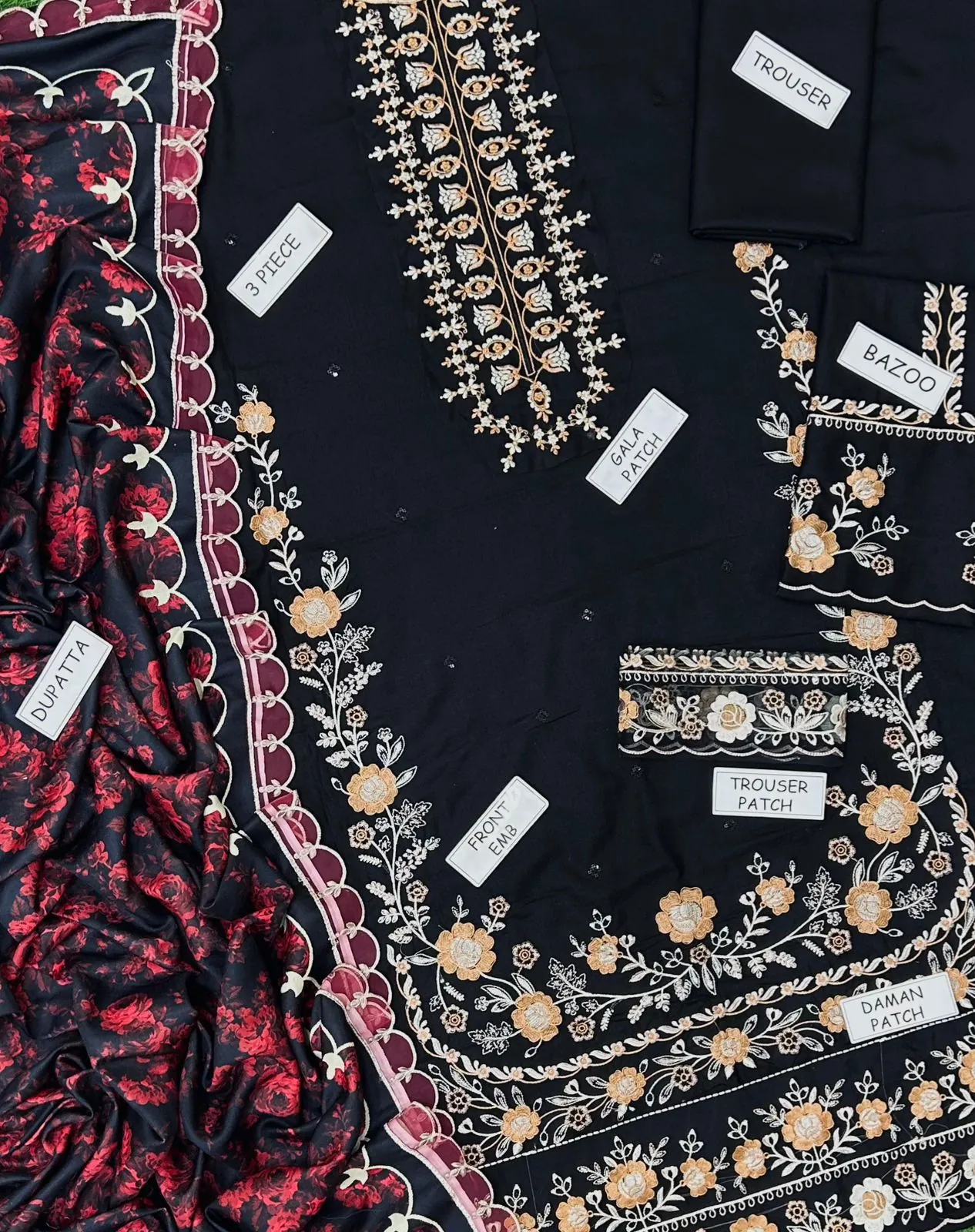 The set includes a magnificent Dhank digital printed shawl (Dupatta), edged with a delicate 4-side embroidered patti, mirroring the elegance of the original designer piece. Complete your look with the matching plain Dhank trouser. This unstitched suit allows you to customize the fit and style to your perfect measurements.