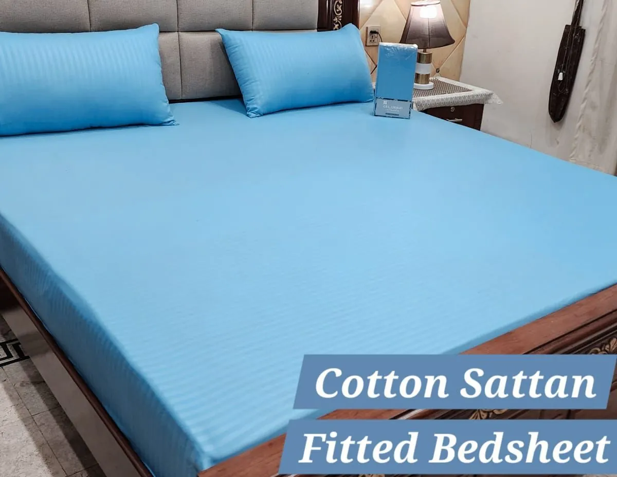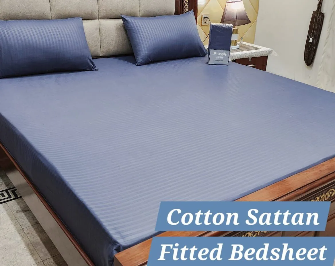 Upgrade your bedding experience with our Export Quality Cotton Sateen Fitted Bedsheet Set. Designed for ultimate comfort and durability, this 3-piece King Size set features a subtle striped pattern in a single elegant color (like the Slate Blue shown in the image).