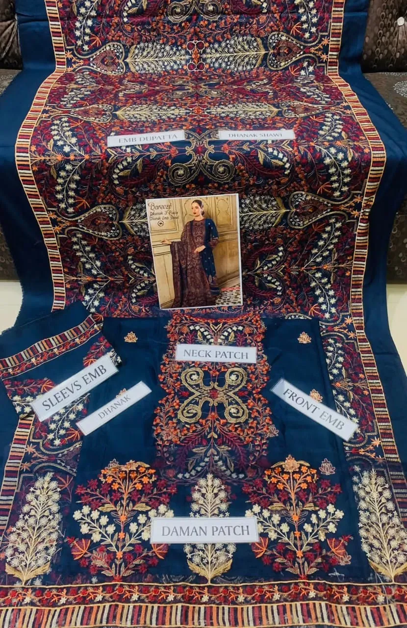 The suit is made from high-quality Dhanak fabric, celebrated for its exceptional warmth, soft feel, and elegant drape, making it the perfect choice for the cooler months in Faisalabad and beyond. The true centerpiece of this ensemble is the breathtaking, fully embroidered Dhanak shawl—a luxurious statement piece that is both beautiful and practical.