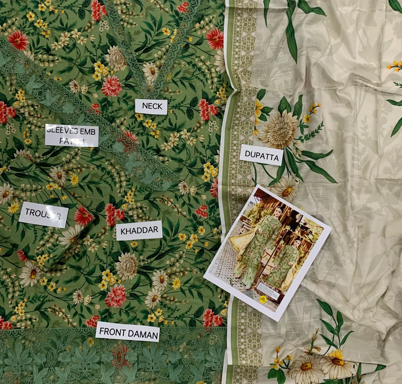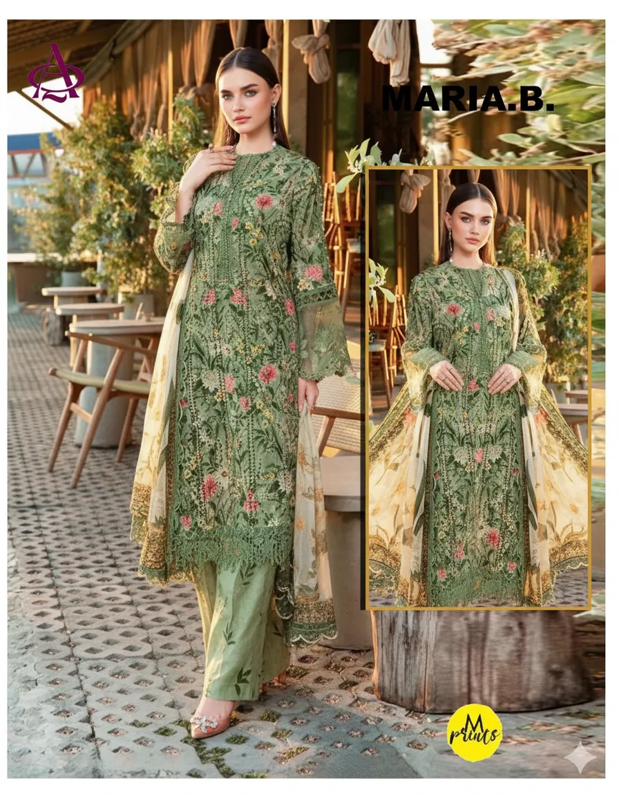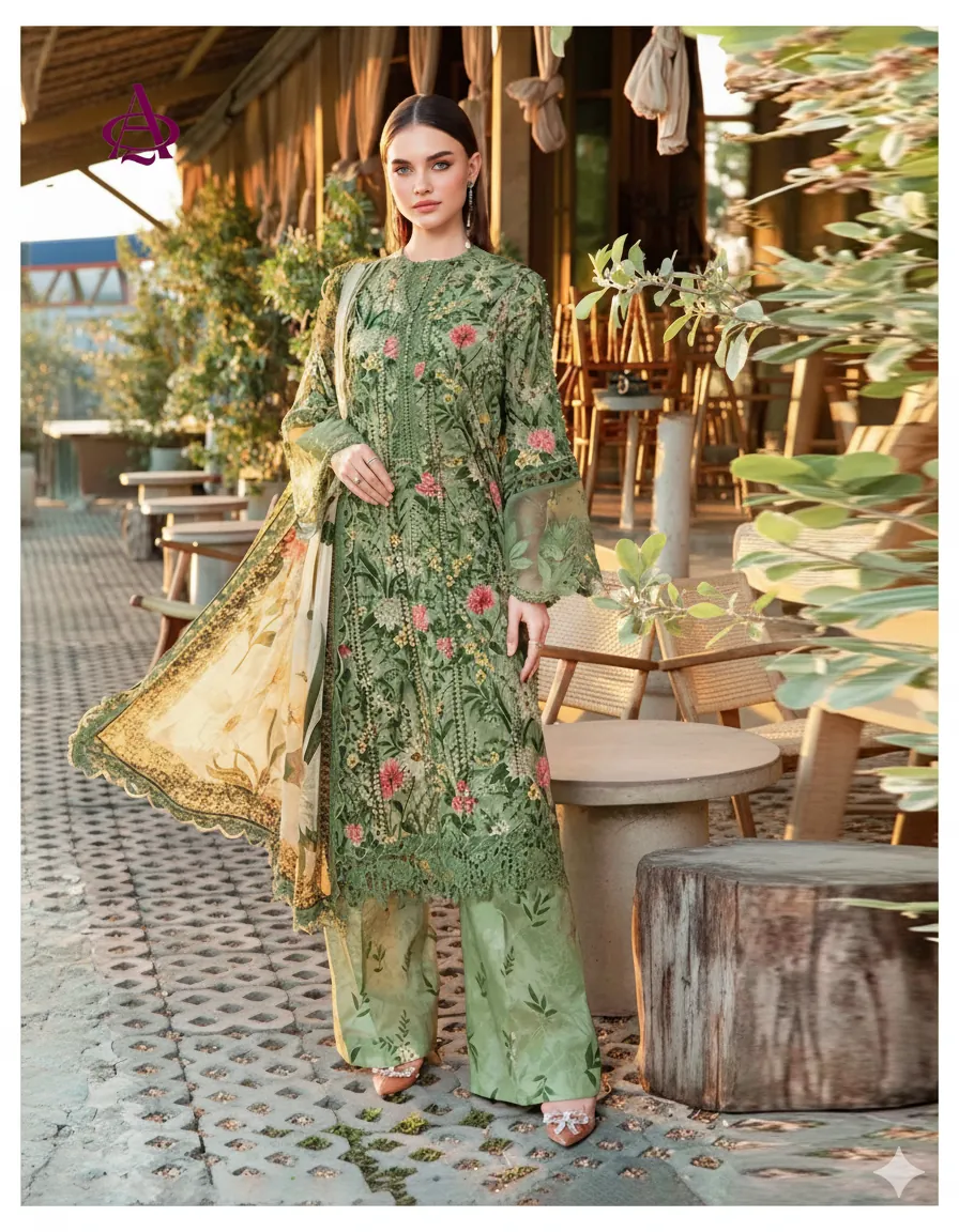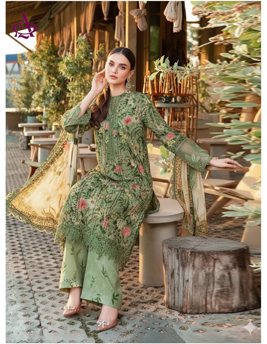 Embrace the cozy elegance of our Alhamdulillah Khadder Collection with this stunning 3-piece unstitched suit. Perfect for the winter season, this ensemble features a rich, dense khadder quality fabric for ultimate warmth and comfort. The shirt is adorned with a beautiful, vibrant all-over floral print in shades of green, red, and yellow, creating a fresh, natural aesthetic. This suit offers a premium, customizable experience with a separate embroidered neck patch and an exquisite embroidered sleeve (bazu) patch to elevate the look. The outfit is completed with a coordinating digital printed shawl (dupatta) and a plain or printed khadder trouser fabric. This collection provides all the necessary components for a truly bespoke and luxurious outfit: printed shirt front, daman patch, printed back, printed sleeves, printed trousers, and a luxurious printed shawl—all in the finest khadder quality. Design a masterpiece that reflects your personal style.