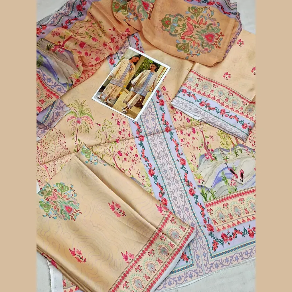 The fabric’s soft texture and rich shine bring a premium touch, while the digital prints add a modern flair without compromising traditional charm. This versatile 3PC unstitched outfit is perfect for festive occasions, family gatherings, parties, or casual day wear.